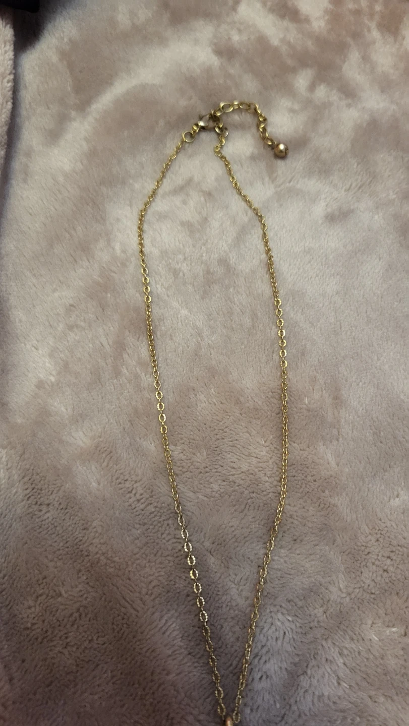 This is a lovely gold-tone necklace with a teardrop pendant. It has a delicate floral design with small rhinestones on one side of the pendant. The chain is also gold-tone and has a lobster clasp closure. It's in great condition and ready to add a touch of elegance to any outfit!