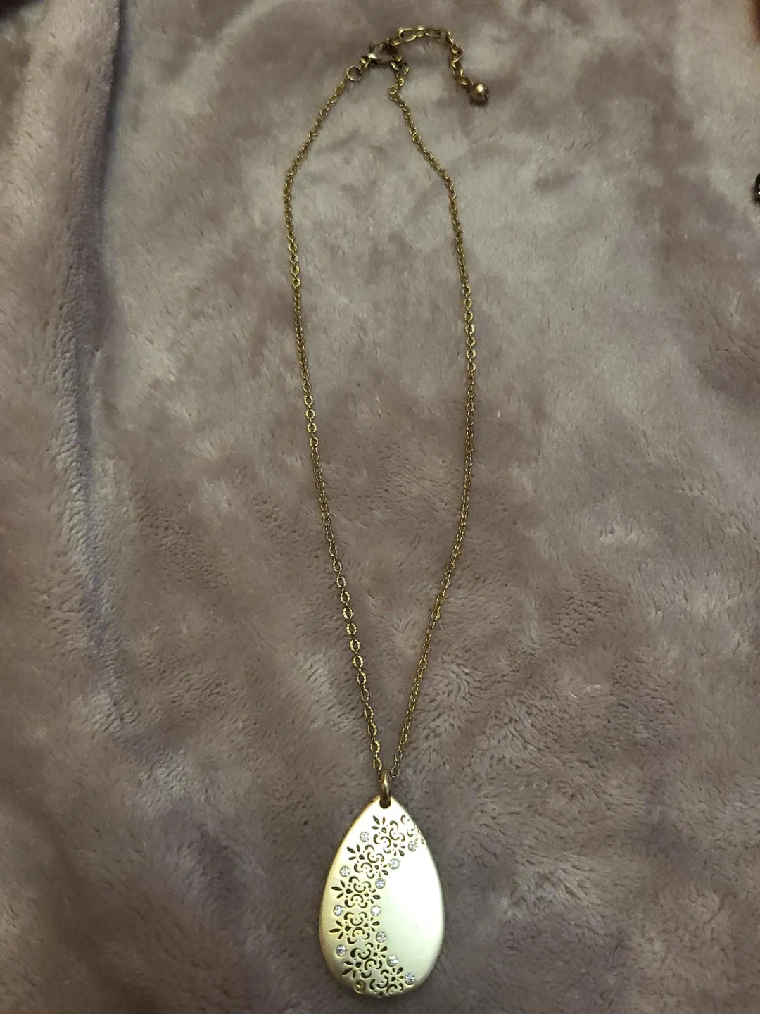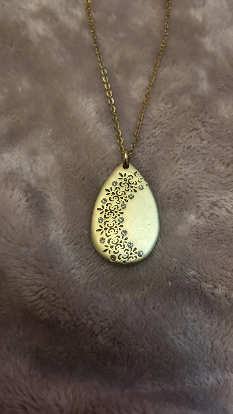 This is a lovely gold-tone necklace with a teardrop pendant. It has a delicate floral design with small rhinestones on one side of the pendant. The chain is also gold-tone and has a lobster clasp closure. It's in great condition and ready to add a touch of elegance to any outfit!