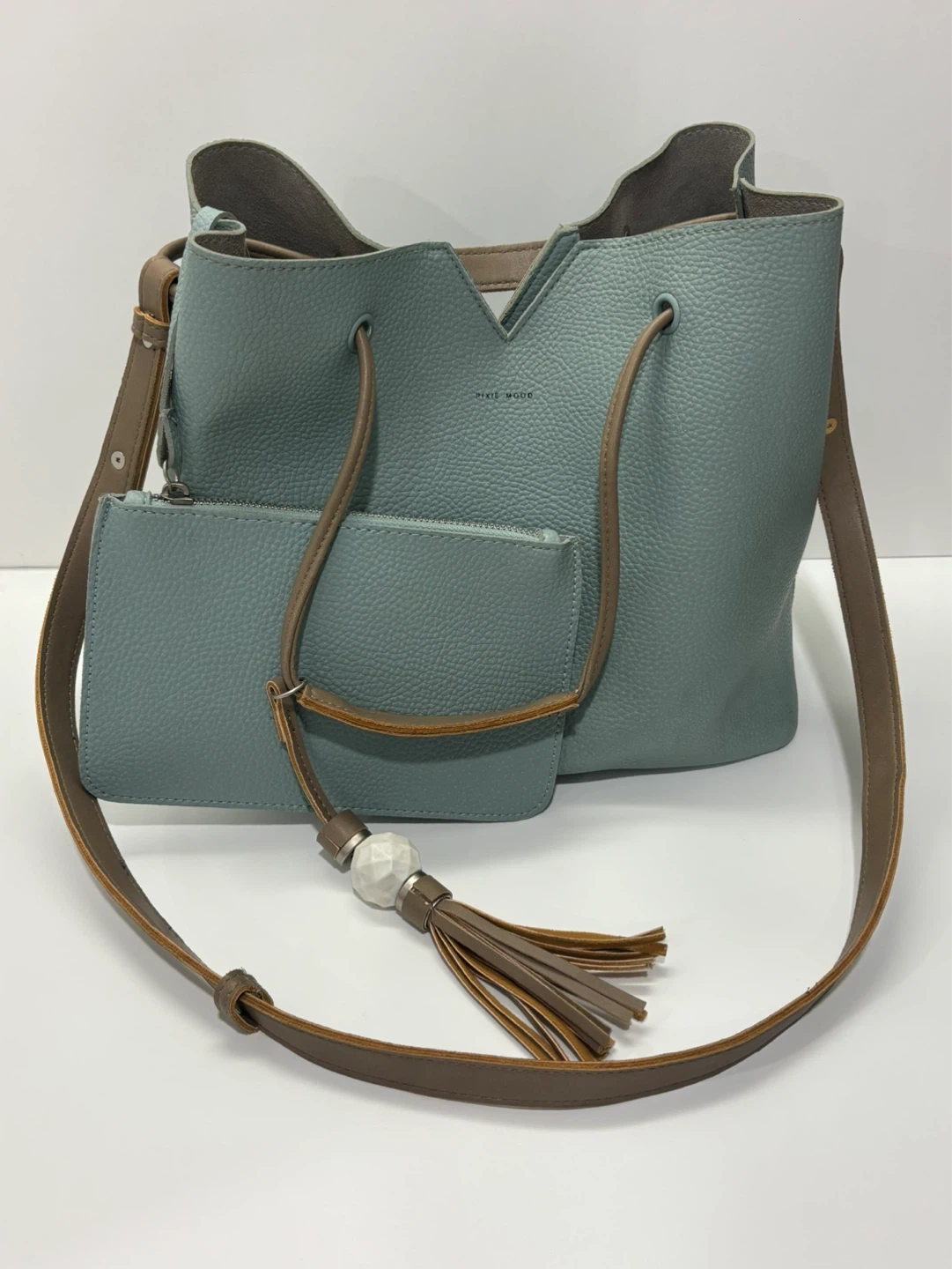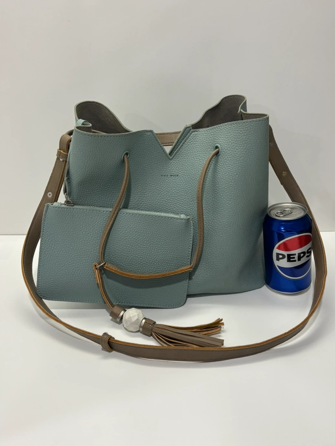 Light teal green textured faux leather women’s purse or bucket bag. Comes with a matching zippered pouch and a decorative tassel. Adjustable crossbody strap included. This bag's unique shape makes it a stylish choice for everyday use!