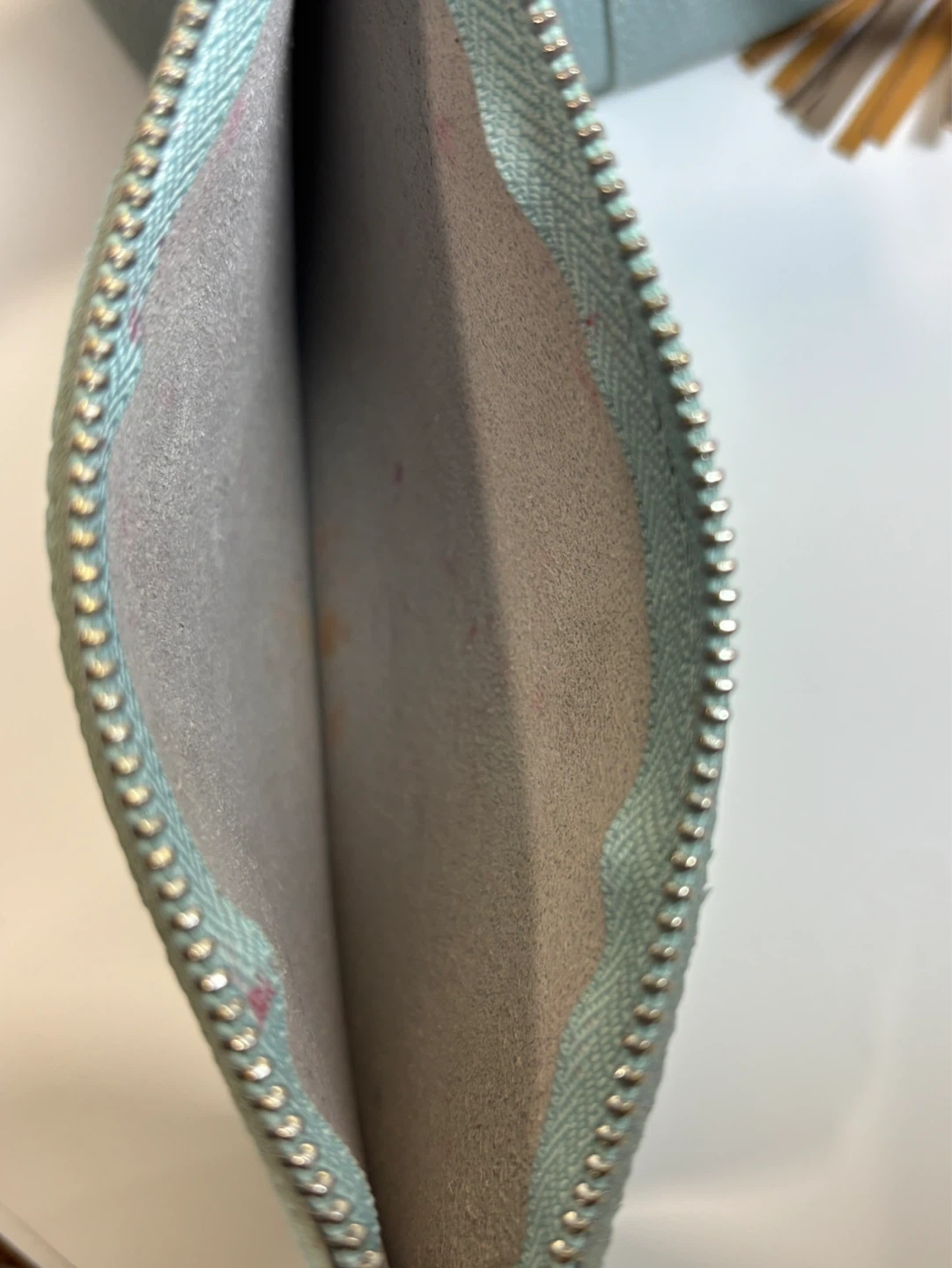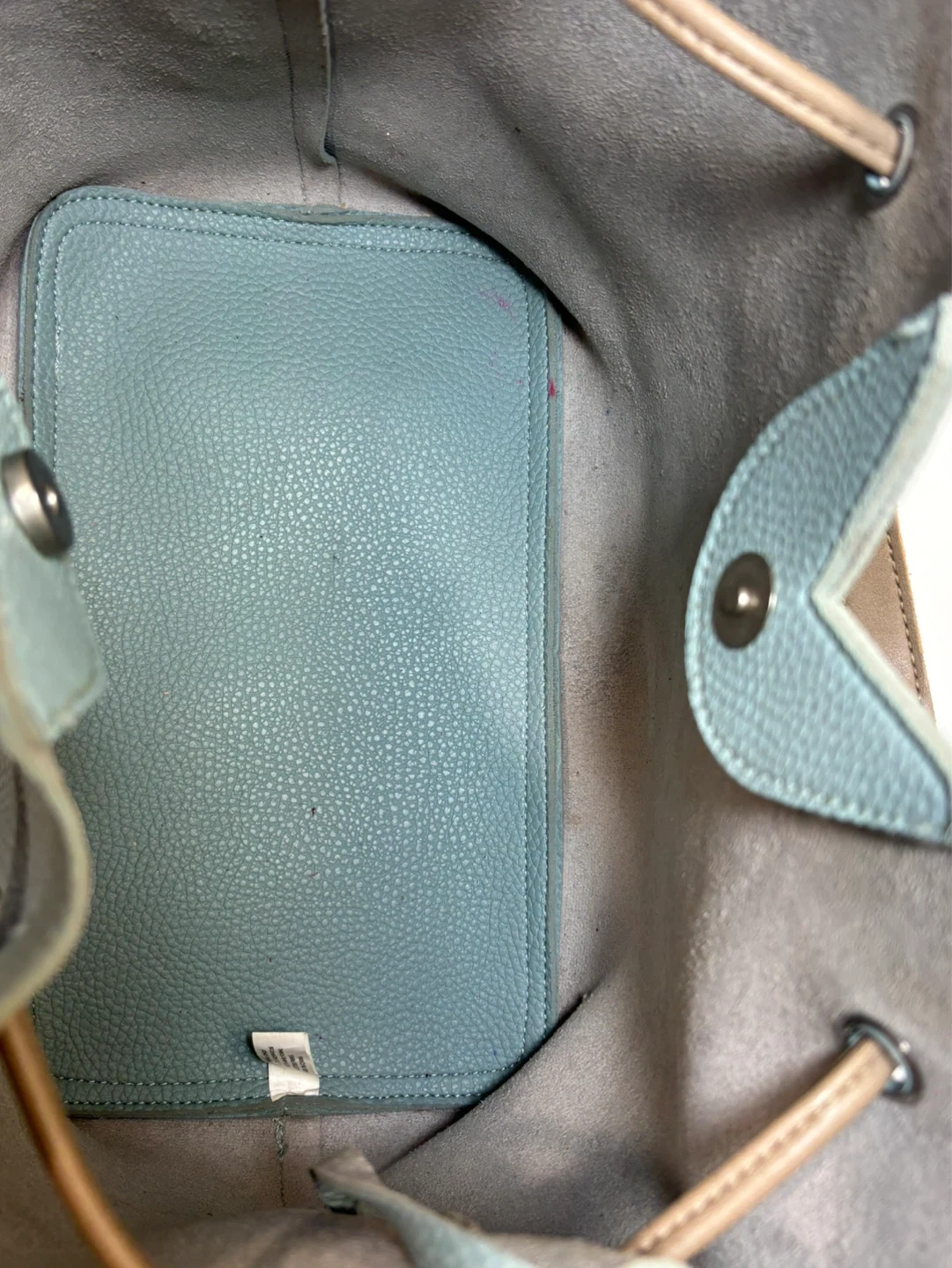 Clean and great condition . Just has a few small makeup marks inside .