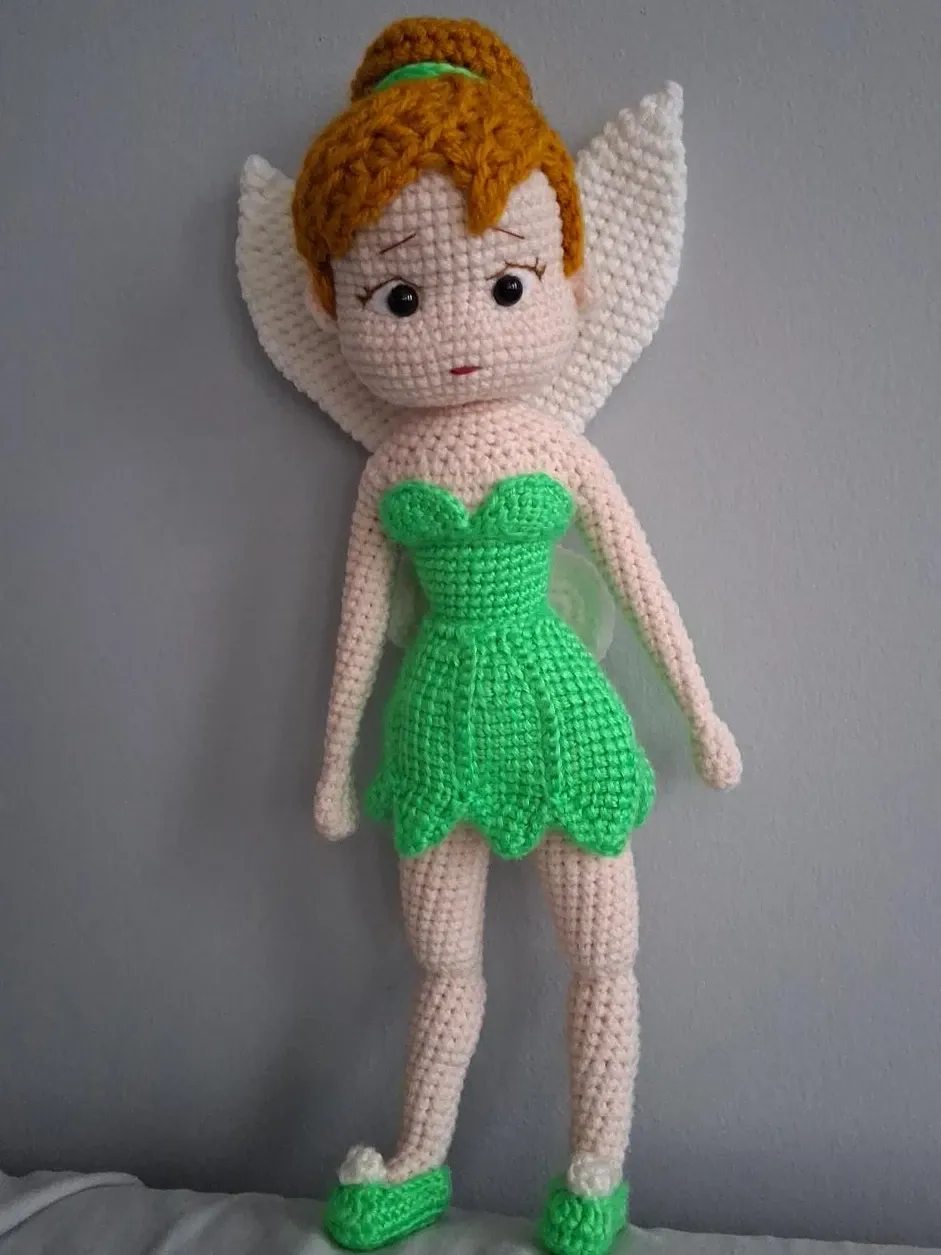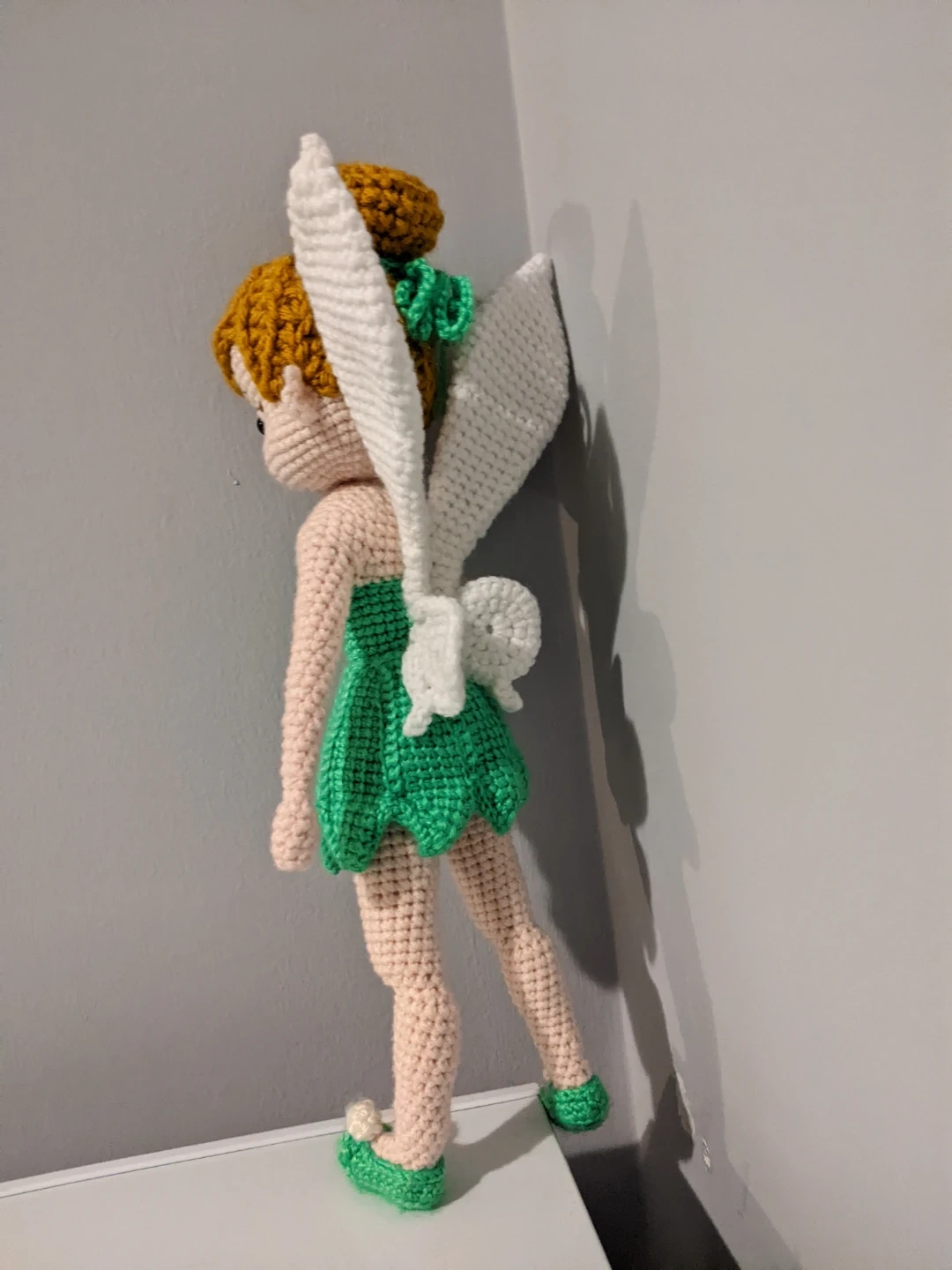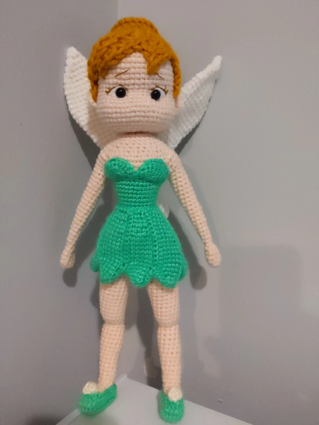 Handmade crocheted doll of Tinkerbell. This charming 14 inch amigurumi features a unique one of a kind design, green dress, white wings, and auburn hair. It's a lovely decorative piece or toy for fans of the character.