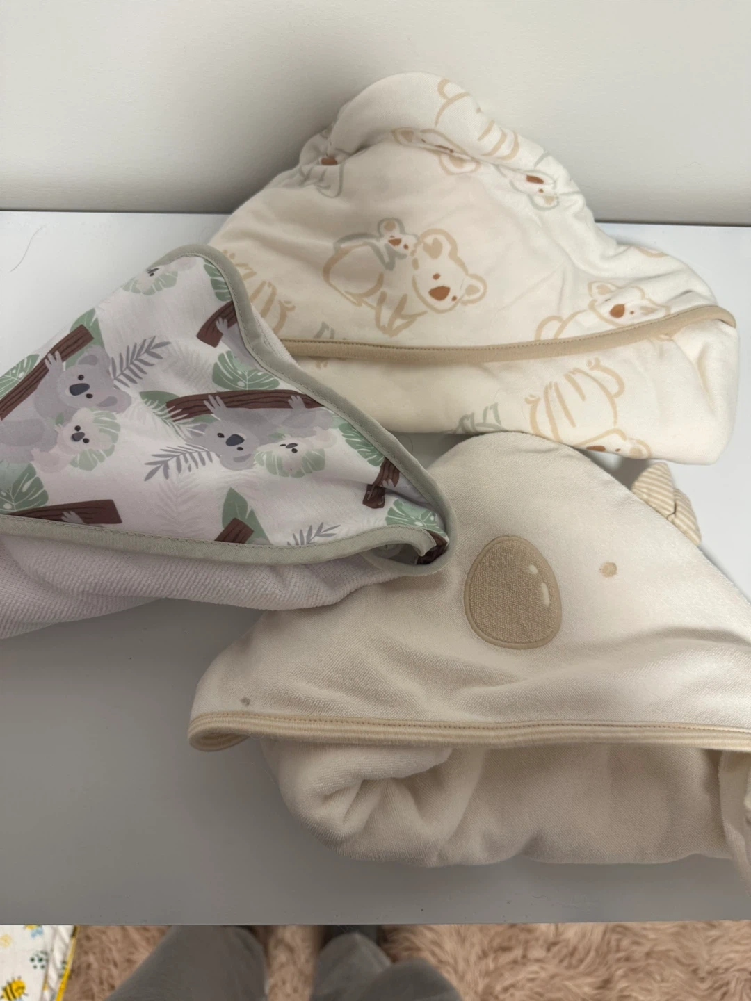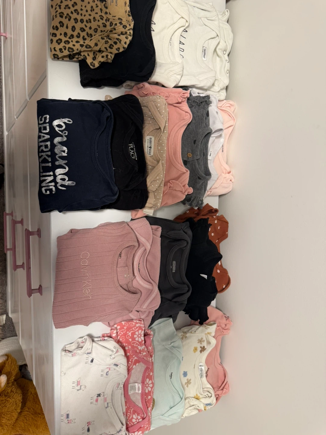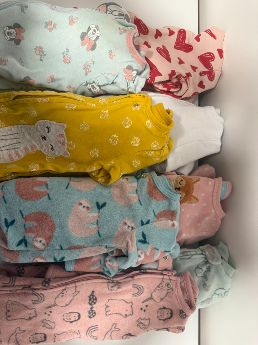 A collection of baby clothes including onesies and pants. Features various fun prints like pears, elephants, and animals. Includes different sizes and colours, perfect for everyday wear.