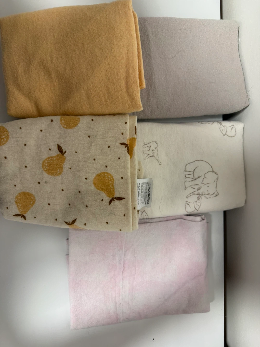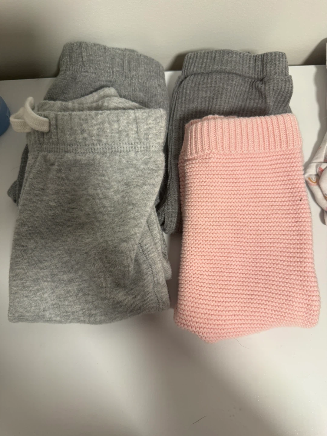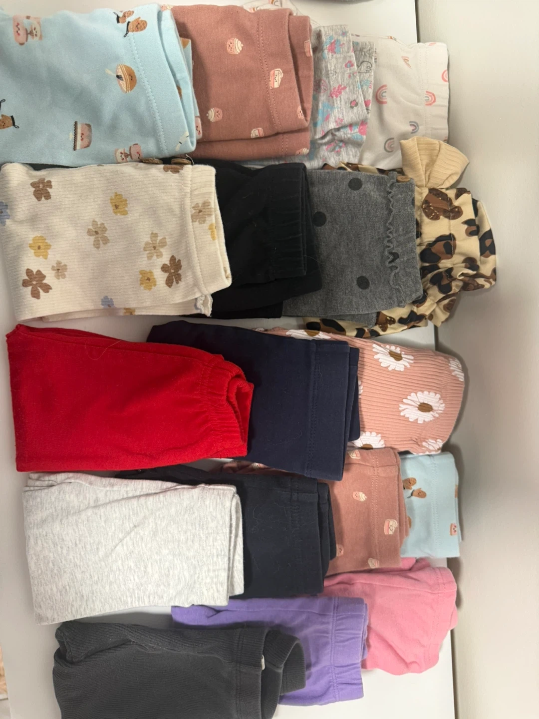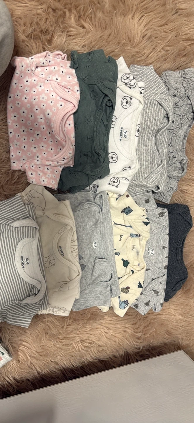 A collection of baby clothes including onesies and pants. Features various fun prints like pears, elephants, and animals. Includes different sizes and colours, perfect for everyday wear.