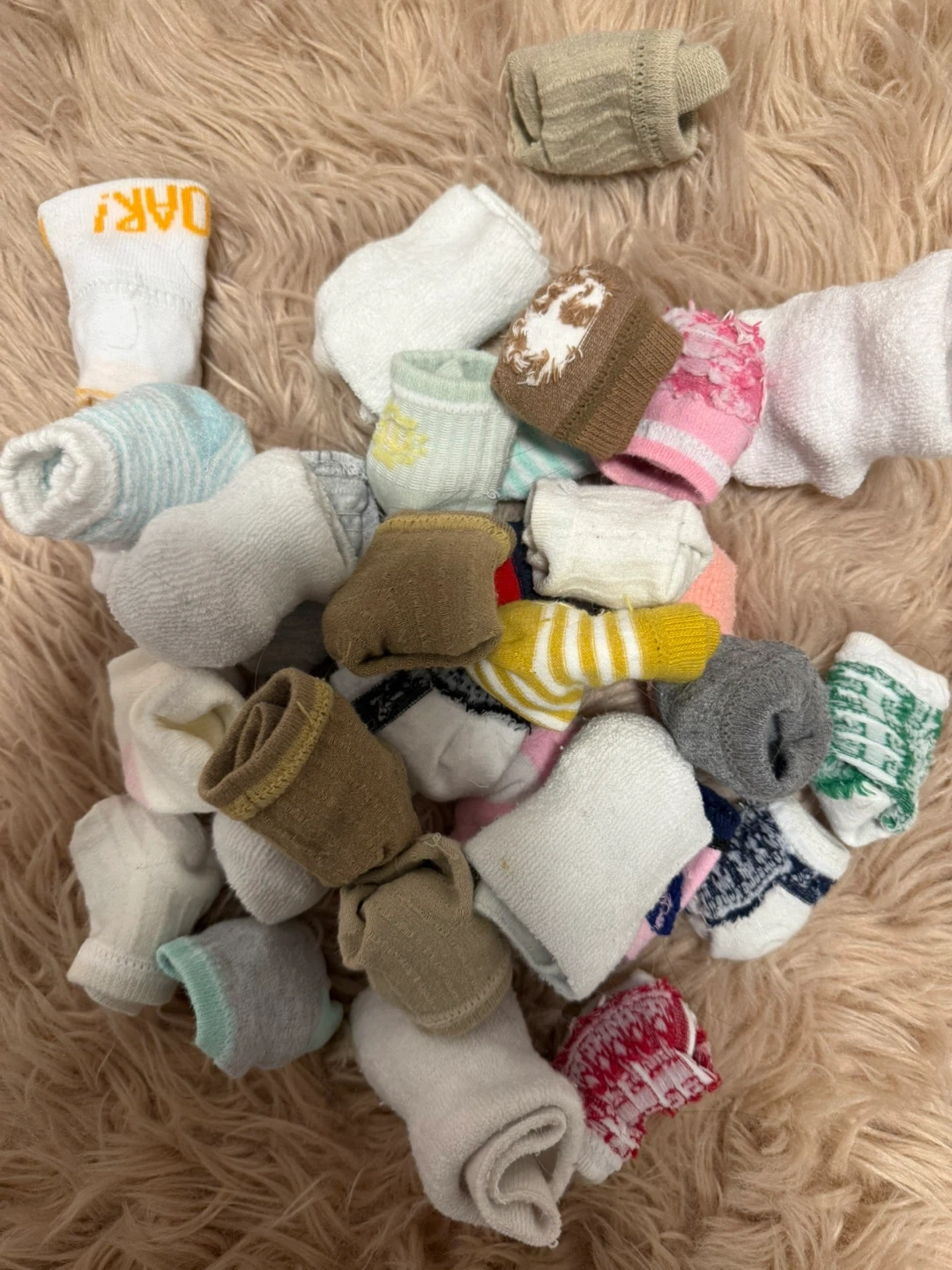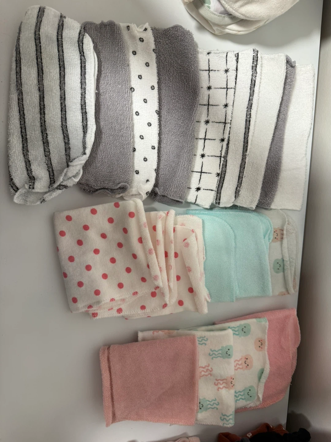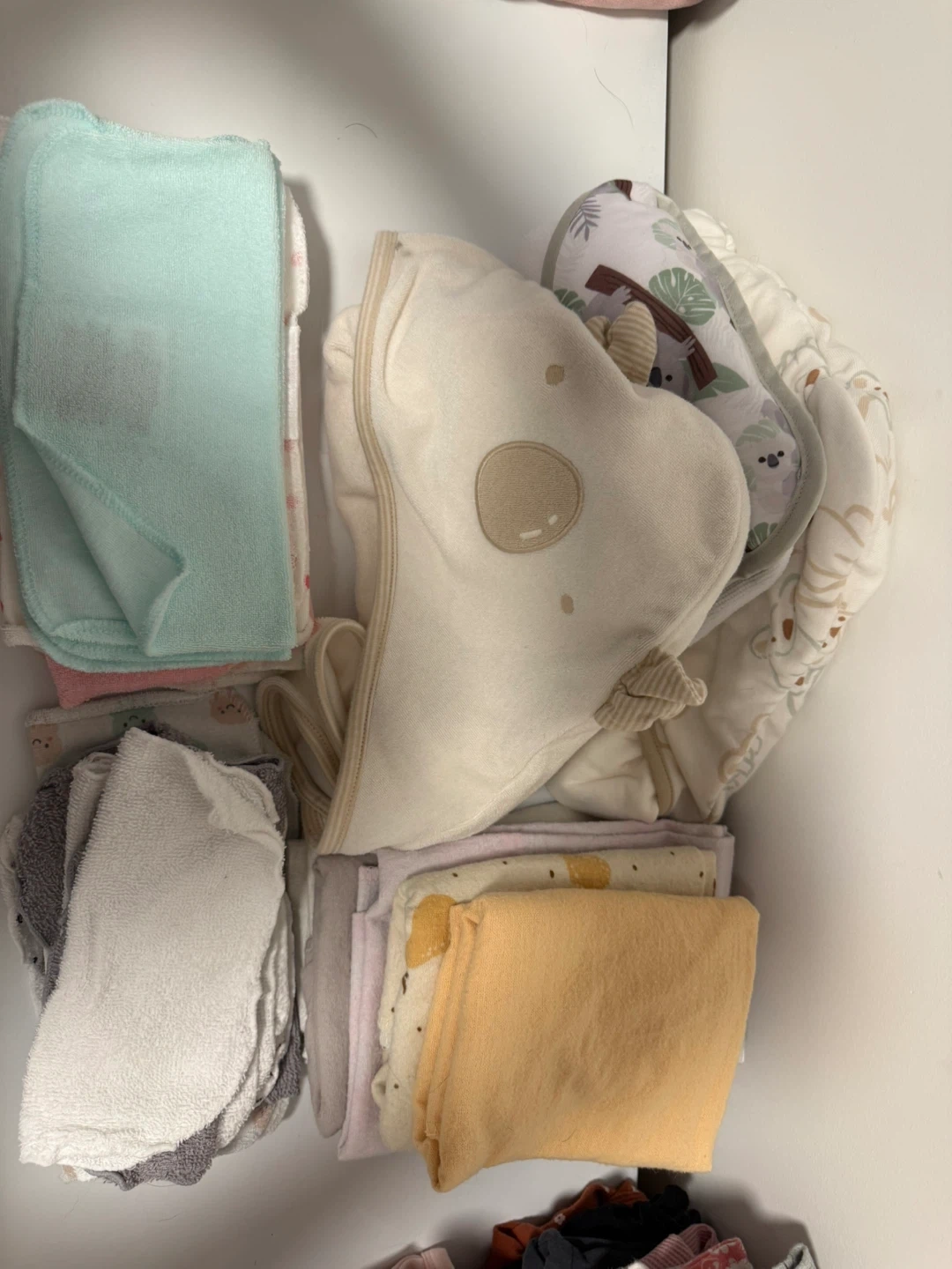 A collection of baby clothes including onesies and pants. Features various fun prints like pears, elephants, and animals. Includes different sizes and colours, perfect for everyday wear.