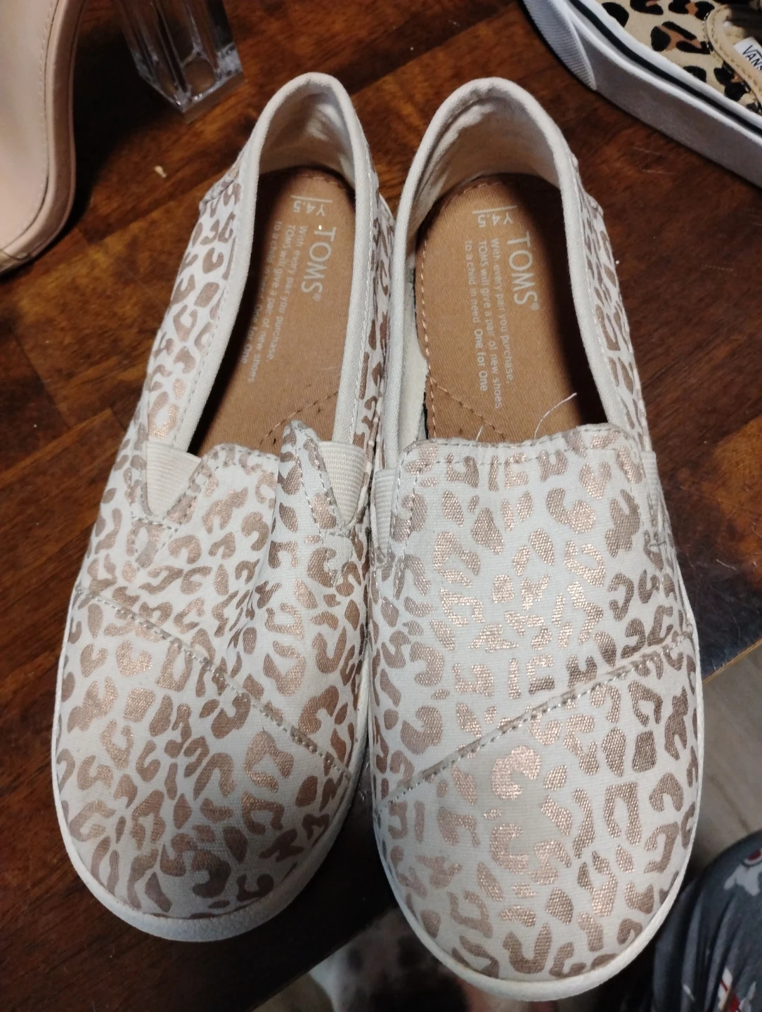 Youth size 4.5 TOMS slip-on shoes with a fun leopard print. White with rose gold metallic accents. Features elastic side gores for easy on and off.