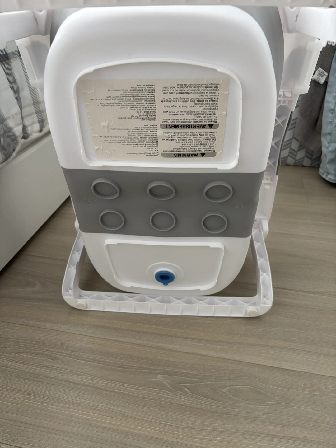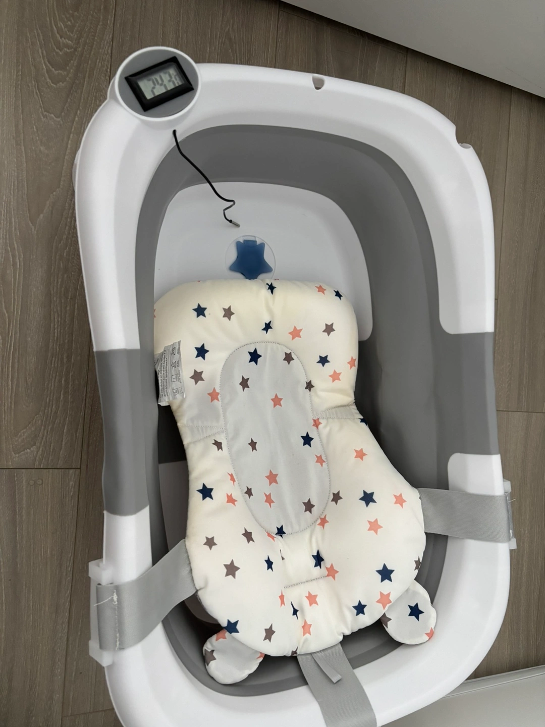 This is a baby bathtub with a support cushion and a built-in thermometer. It is great for bathing a baby!