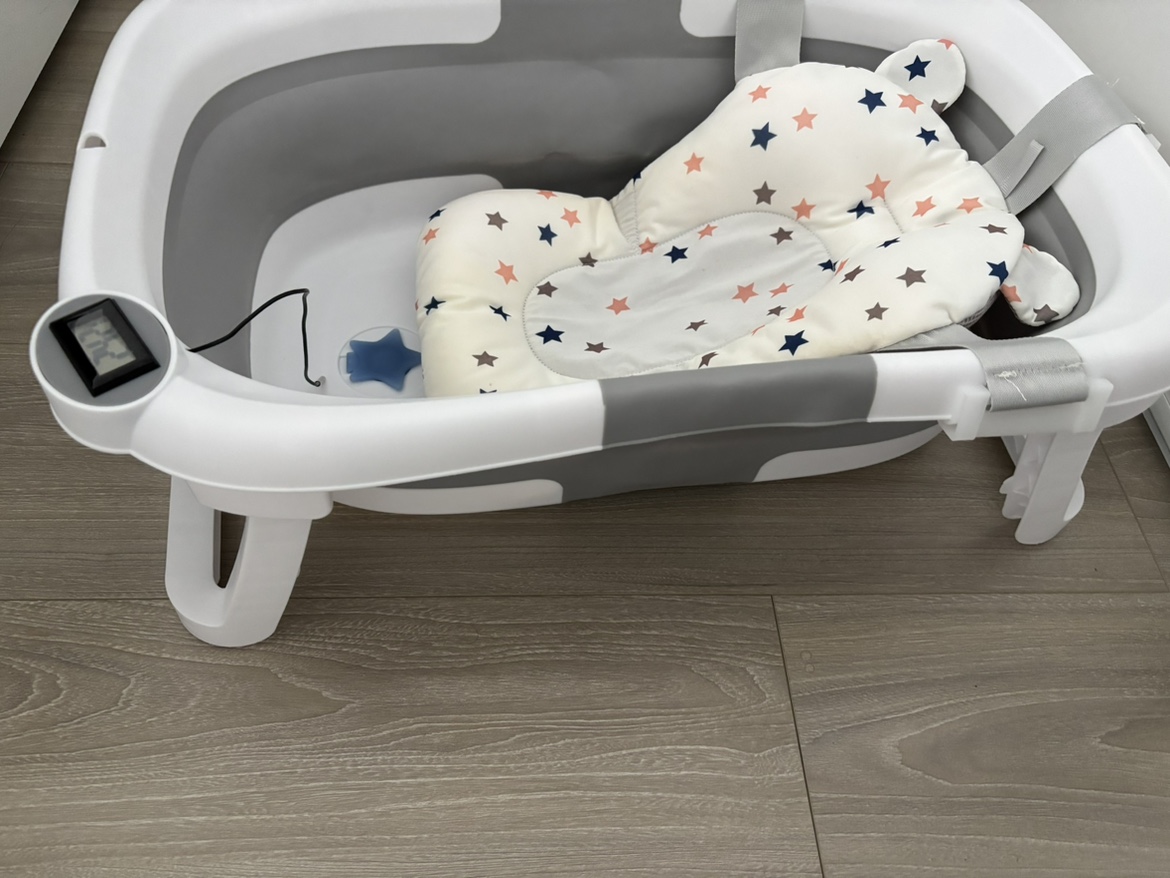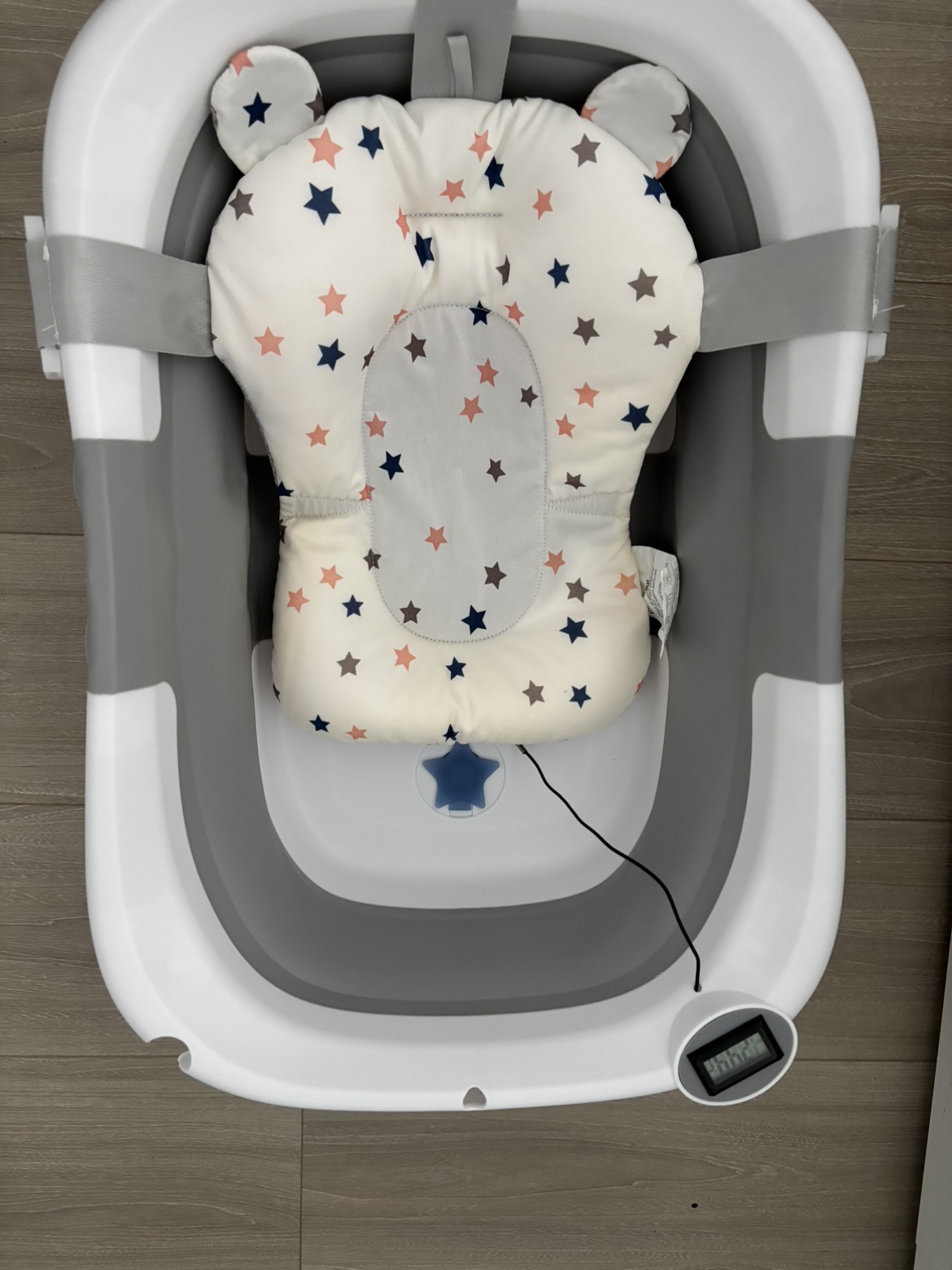 This is a baby bathtub with a support cushion and a built-in thermometer. It is great for bathing a baby!