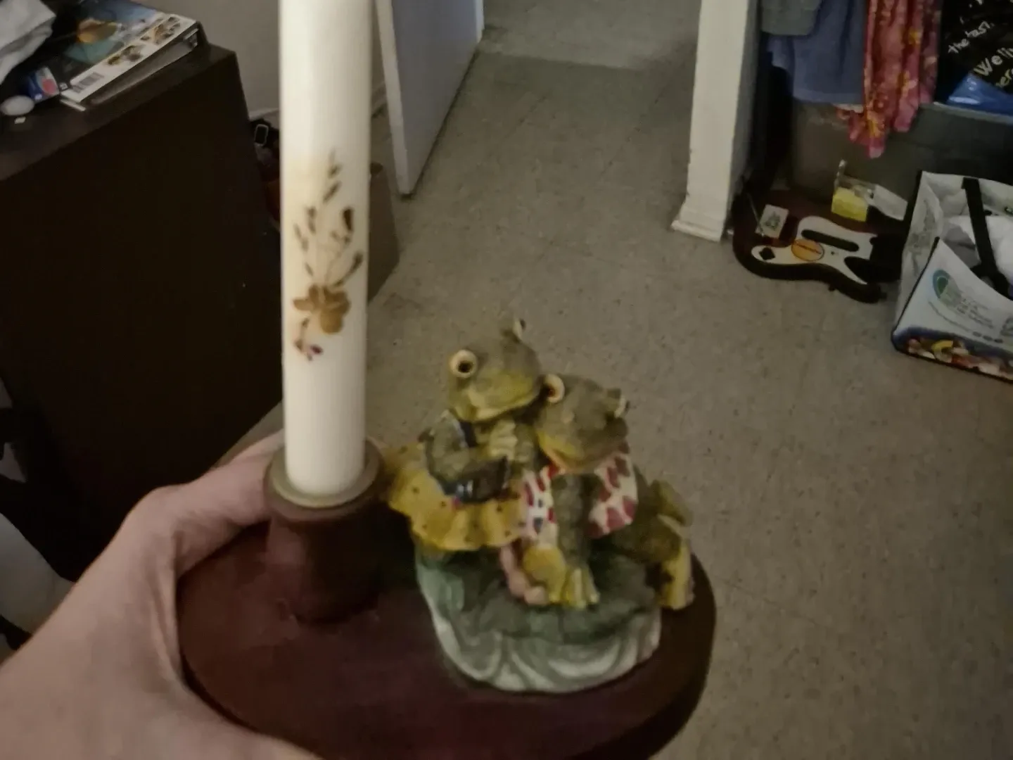 Cute candle holder featuring two decorative frogs. It's made of resin and wood. This piece adds a whimsical touch to any room's decor. It's perfect for holding a single taper candle.