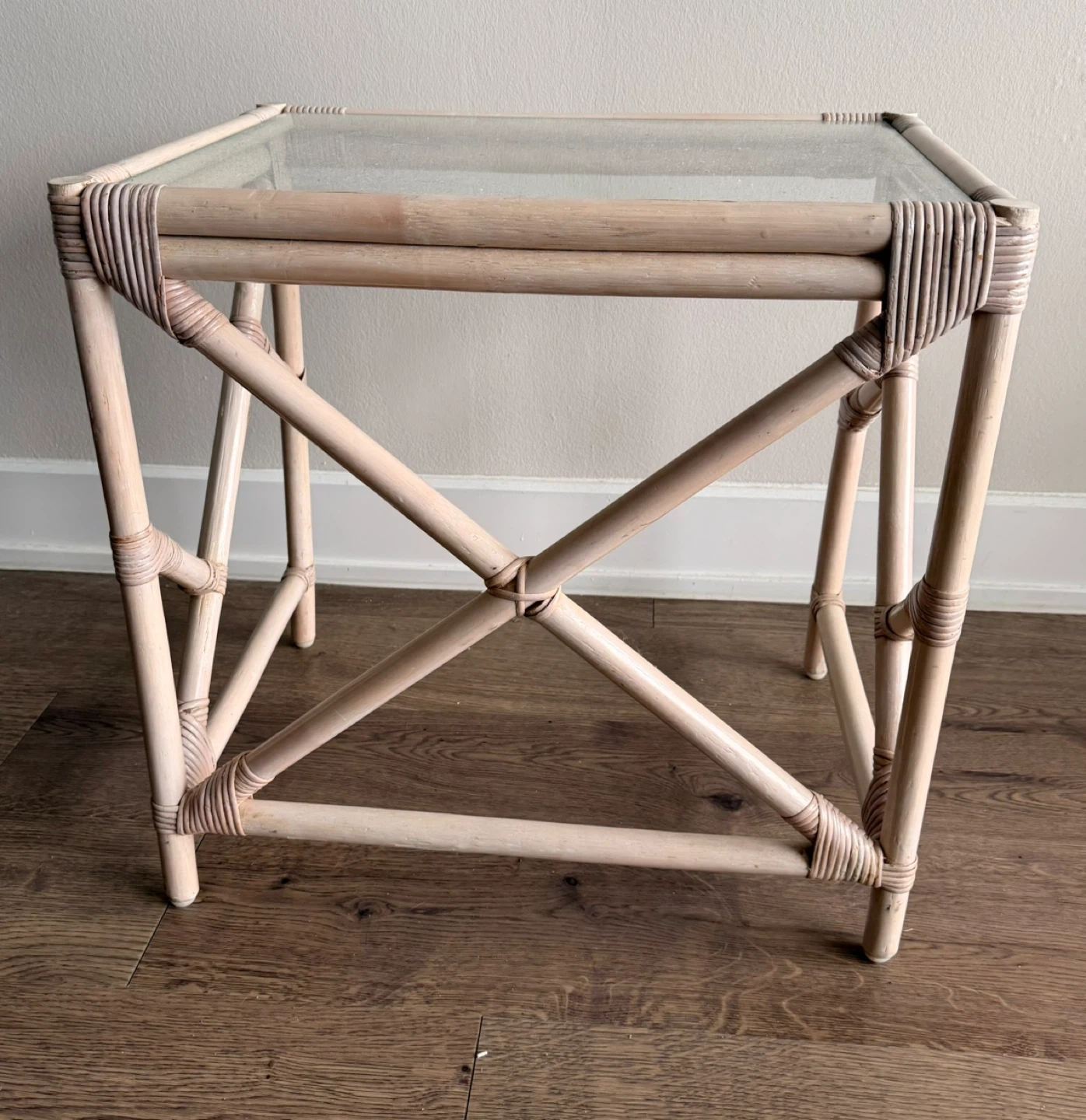 Selling a cute rattan side table with a glass top! It's in great shape and would look lovely in any living room or bedroom. The light colour of the rattan gives it a nice, airy feel.