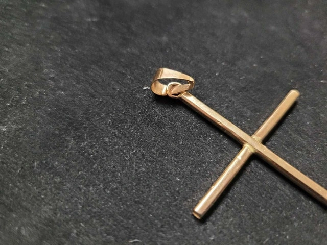 For sale is an 8.03 gram, 14 kt gold, 3" cross. My father had it custom made at Fooshin jewelry store on Richmond Road in the Glebe. He picked it up this morning, but it turned out to be too big. It was supposed to be 1.5 to 2" long but ended up being 3+" long. He brought the jewelers 7.5 grams of 14kt and 1.5 grams of 10k for a total of 9 grams. The cross weighs 8.03 grams and has no stamp. Asking $1500. Pick up at the OPP POLICE STATION PARKING LOT ON CAMPEAU STREET IN KANATA. Thank you