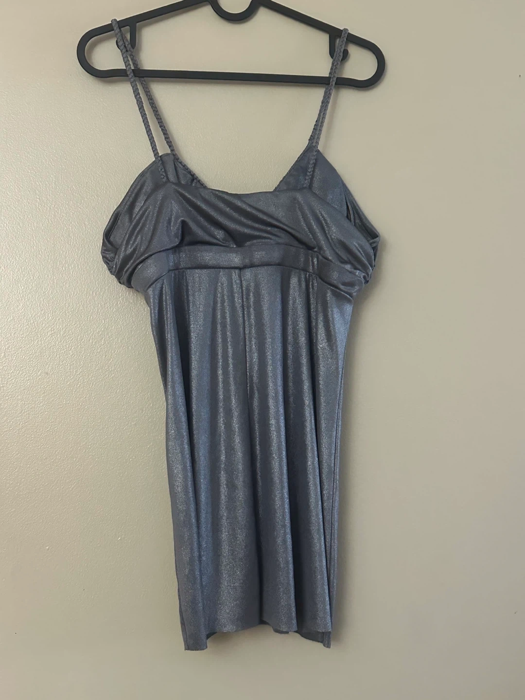 Add a touch of sparkle to your wardrobe with this used 725 Originals Top! Featuring a shimmery silver fabric and spaghetti straps, this top is perfect for a night out. It's in good condition, ready for its next adventure. Please note top and a pin hole on the back.