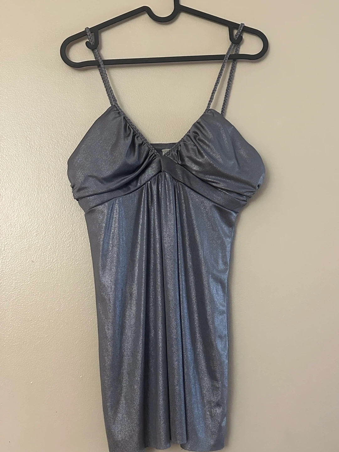 Add a touch of sparkle to your wardrobe with this used 725 Originals Top! Featuring a shimmery silver fabric and spaghetti straps, this top is perfect for a night out. It's in good condition, ready for its next adventure. Please note top and a pin hole on the back.