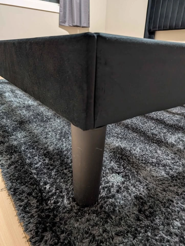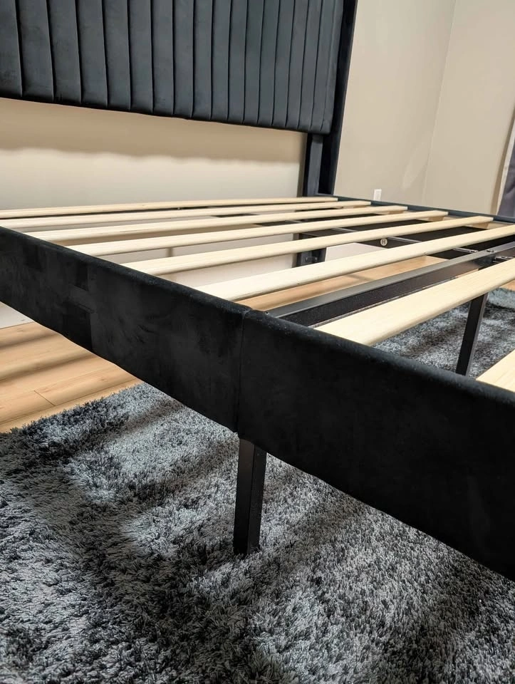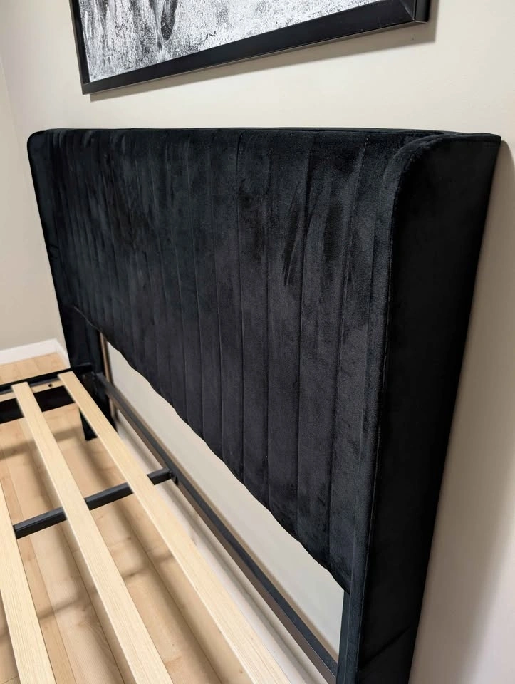 Selling a queen velvet upholstered platform bed in excellent condition. It features a modern wingback headboard and a sturdy, supportive frame. Fabric: Black velvet (soft and durable). Includes wooden slat kit; no box spring required. Kiln-dried wood frame with an 800 lb. weight capacity. Headboard is 47" H with 8" under-bed clearance for storage. Fits any standard Queen mattress. From a smoke-free and pet-free home. Clean and well-maintained with no stains or damage.