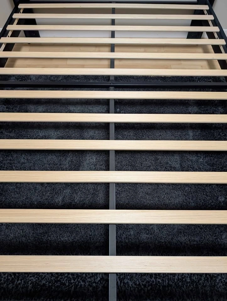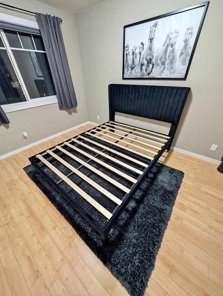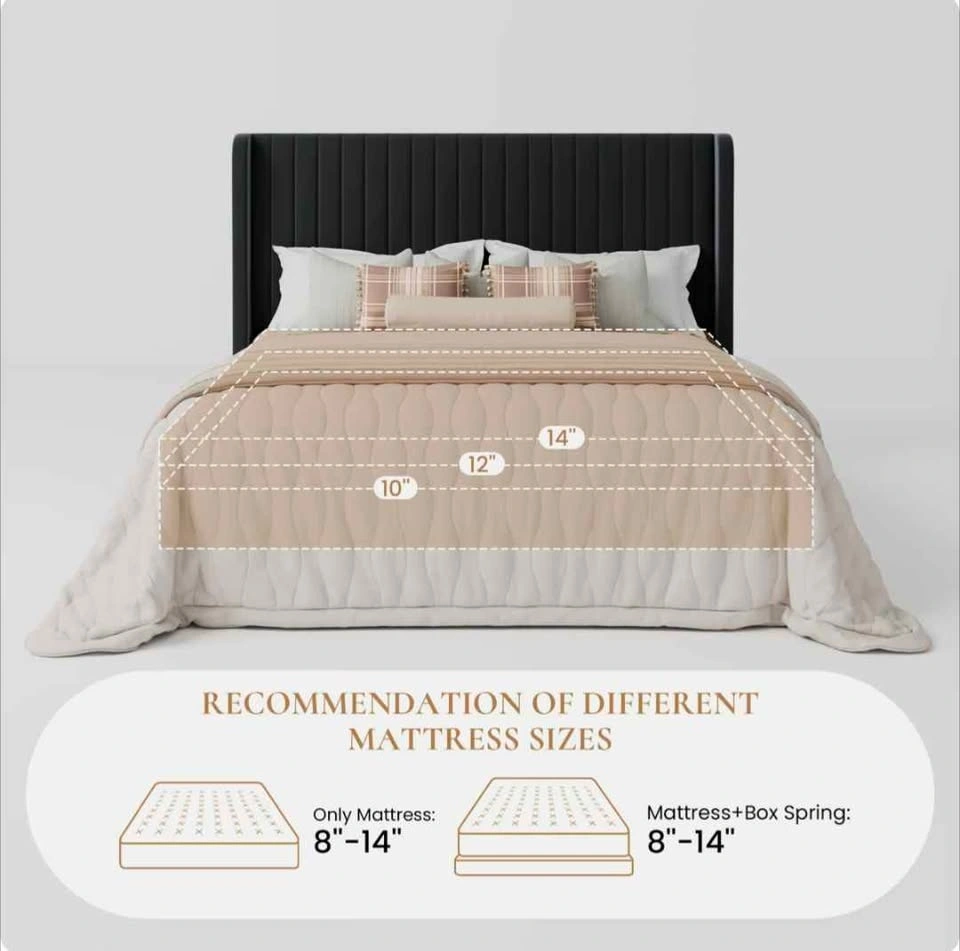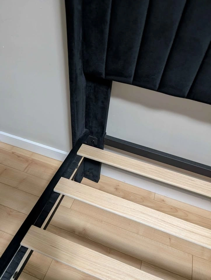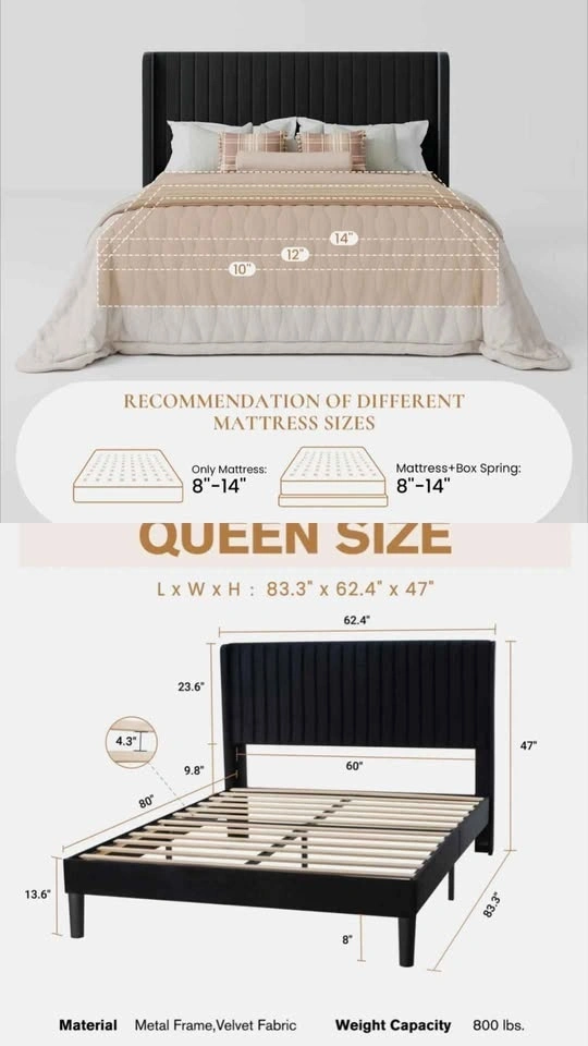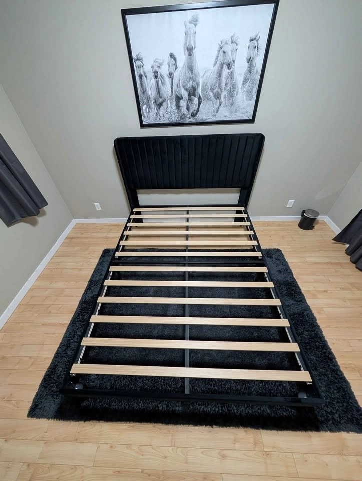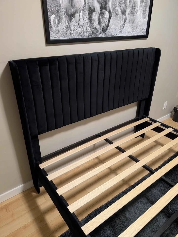 Selling a queen velvet upholstered platform bed in excellent condition. It features a modern wingback headboard and a sturdy, supportive frame. Fabric: Black velvet (soft and durable). Includes wooden slat kit; no box spring required. Kiln-dried wood frame with an 800 lb. weight capacity. Headboard is 47" H with 8" under-bed clearance for storage. Fits any standard Queen mattress. From a smoke-free and pet-free home. Clean and well-maintained with no stains or damage.