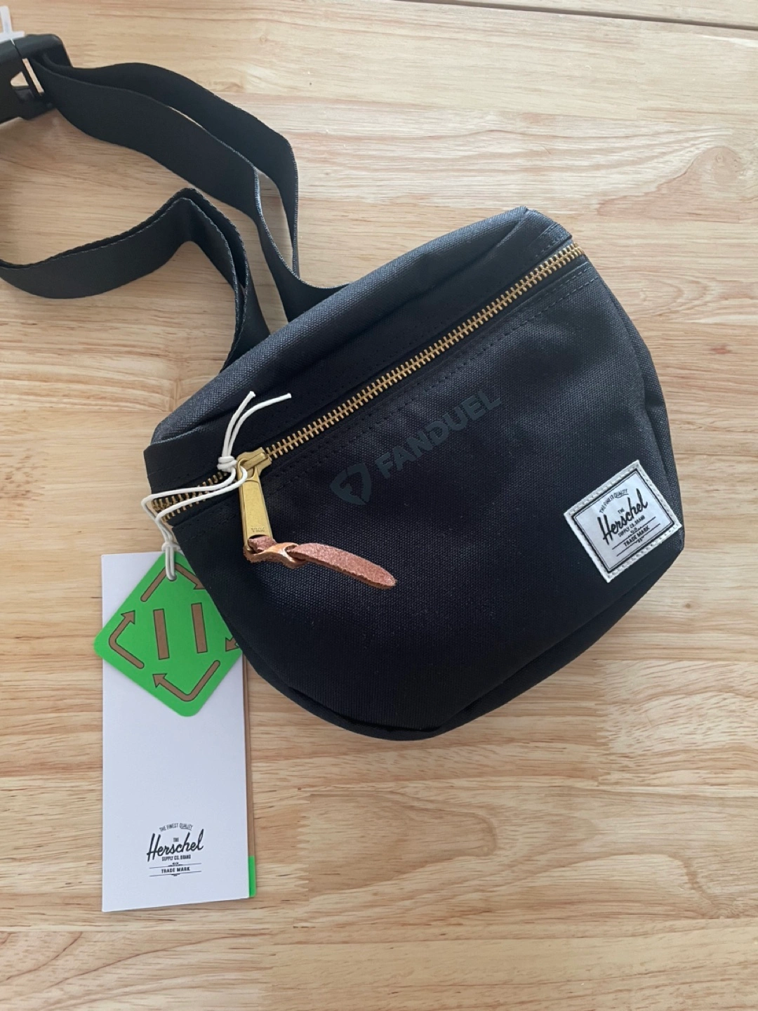Black hip bag. Adjustable strap. Gold zipper. FanDuel branding but super hard to tell in regular light. Herschel Supply Co. tag.