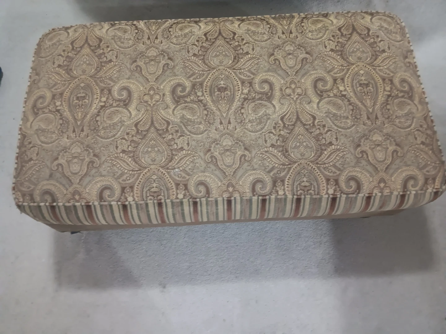 Marilyn Monroe Love Seat and matching ottoman upholstered in a soft, neutral fabric. Features decorative paisley patterned toss pillows for added style. It's a great set for a reading nook or living room.