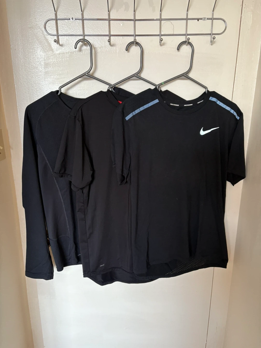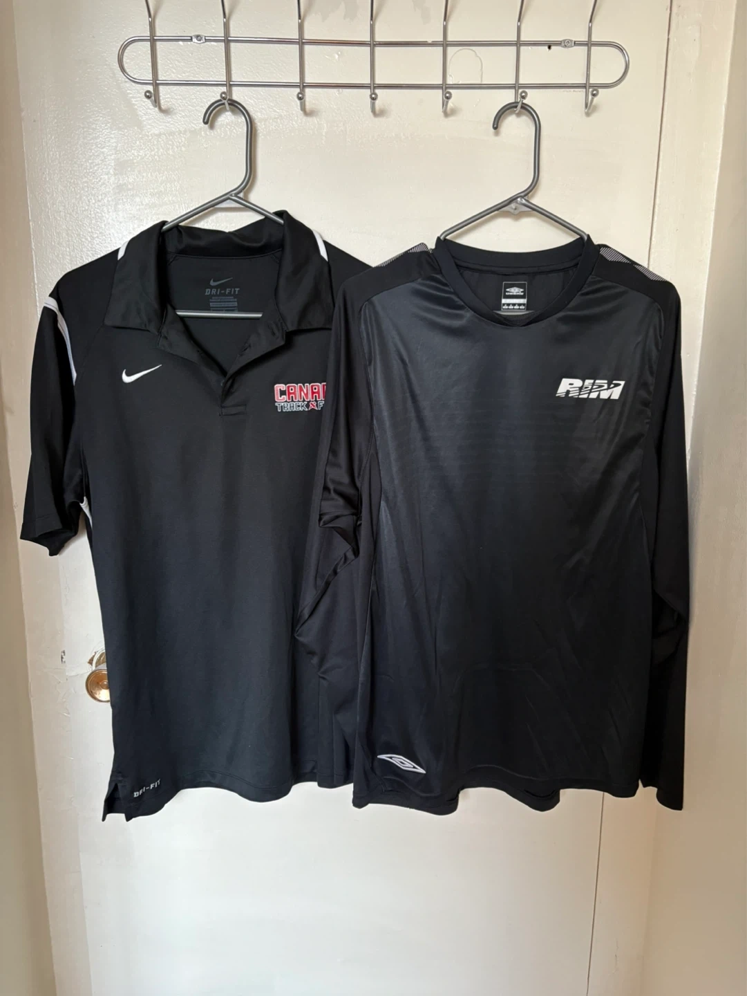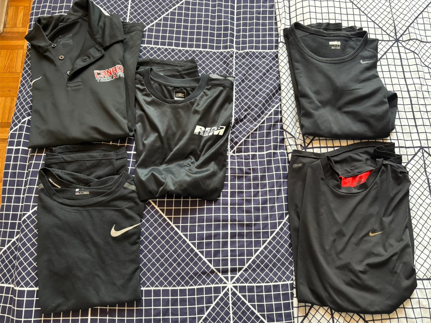 Includes three Nike Dri-FIT shirts, one with long sleeves and two short-sleeved. Also includes a short-sleeved Nike polo with a 'Canada' graphic and a long-sleeved 'RJM' athletic shirt. These are great for training!