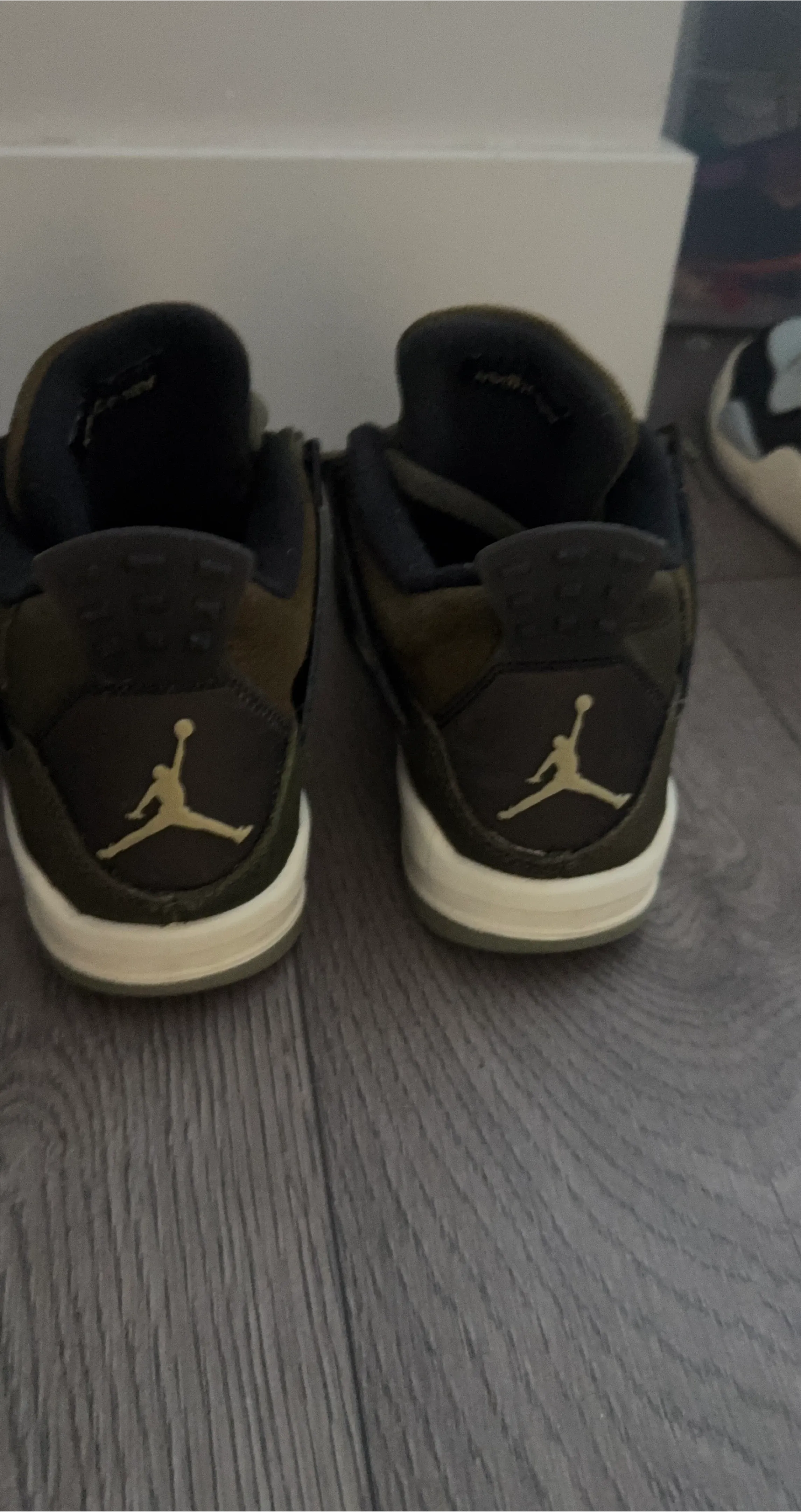 Selling a pair of Jordan 4 Retro Olive Canvas shoes! The shoes feature the iconic Jumpman logo on the heel. They appear to be in good condition. Perfect for everyday wear!