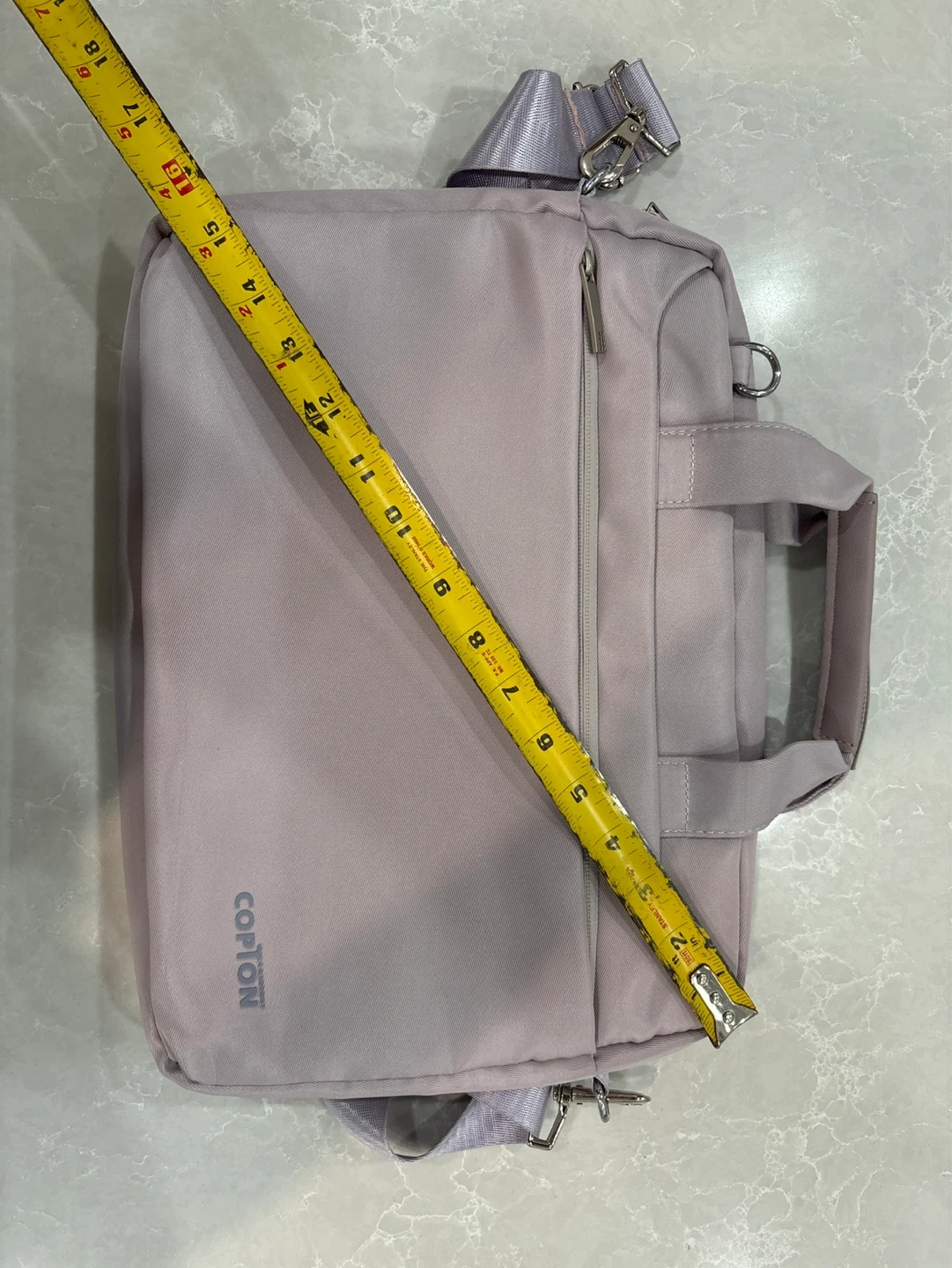 This is a light purple laptop bag from COPTOM. It has a zippered main compartment and a detachable shoulder strap. The bag measures approximately 15 inches in length.