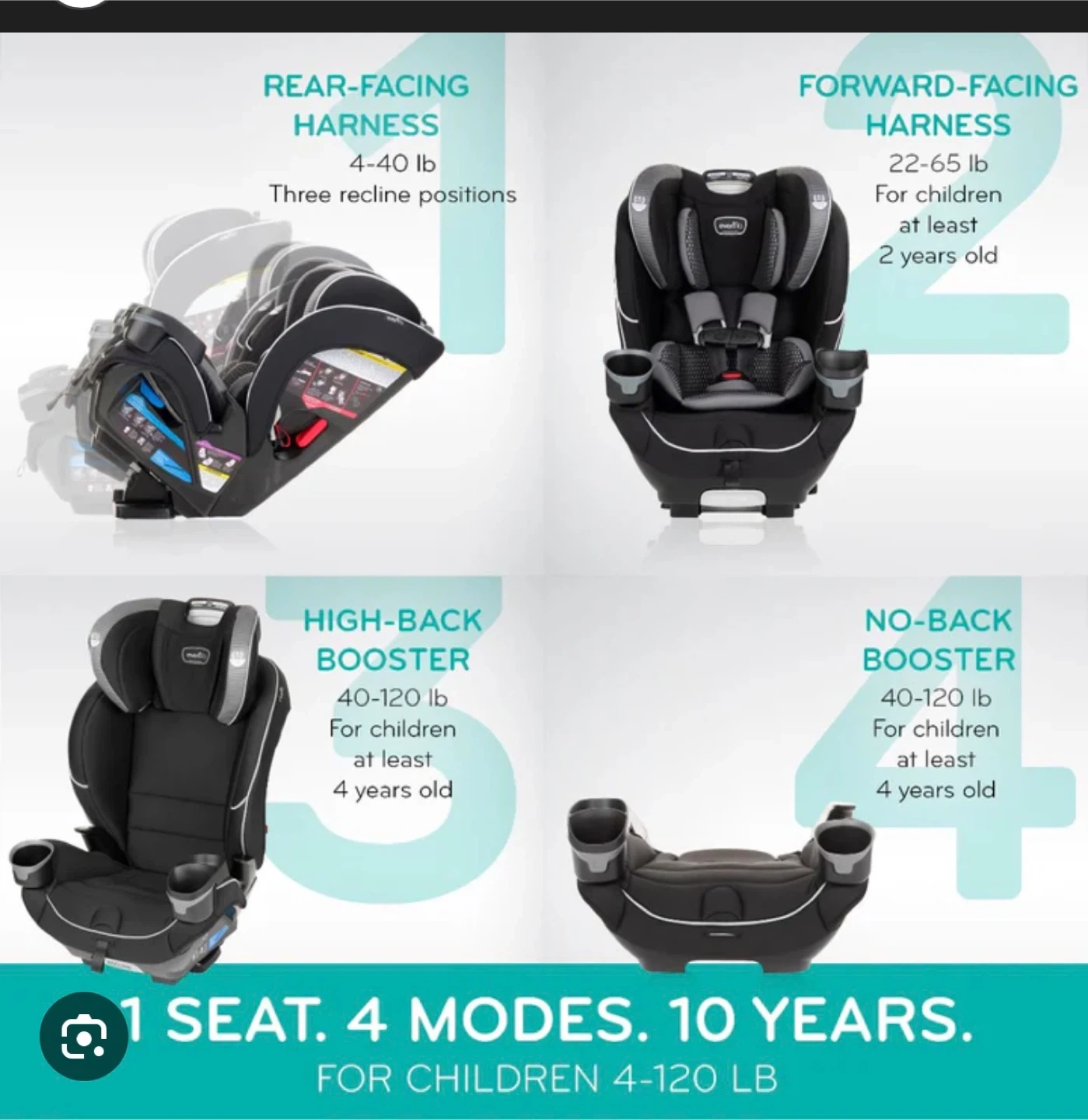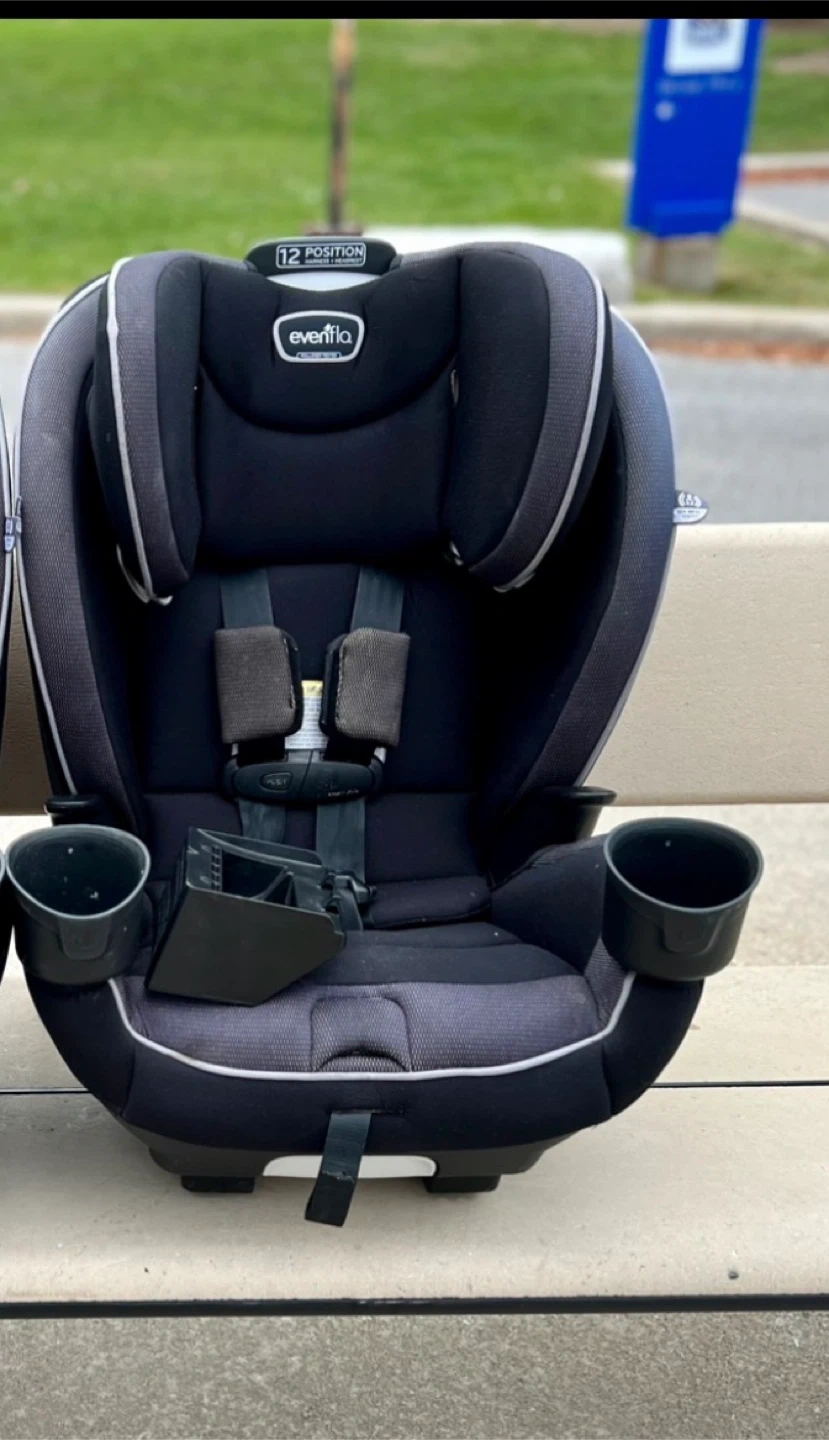 Evenflo All4Stages Slim 4-in-1 All-In-One Car Seat (0-12 Years) Rear-Facing, Forward-Facing, High-Back Booster, and No-Back Booster. The 12-position headrest and four rear-facing recline options, forward-facing recline options for optimal positioning and improved vehicle fit