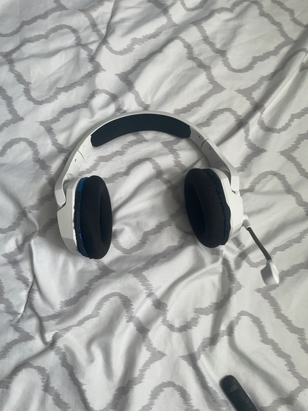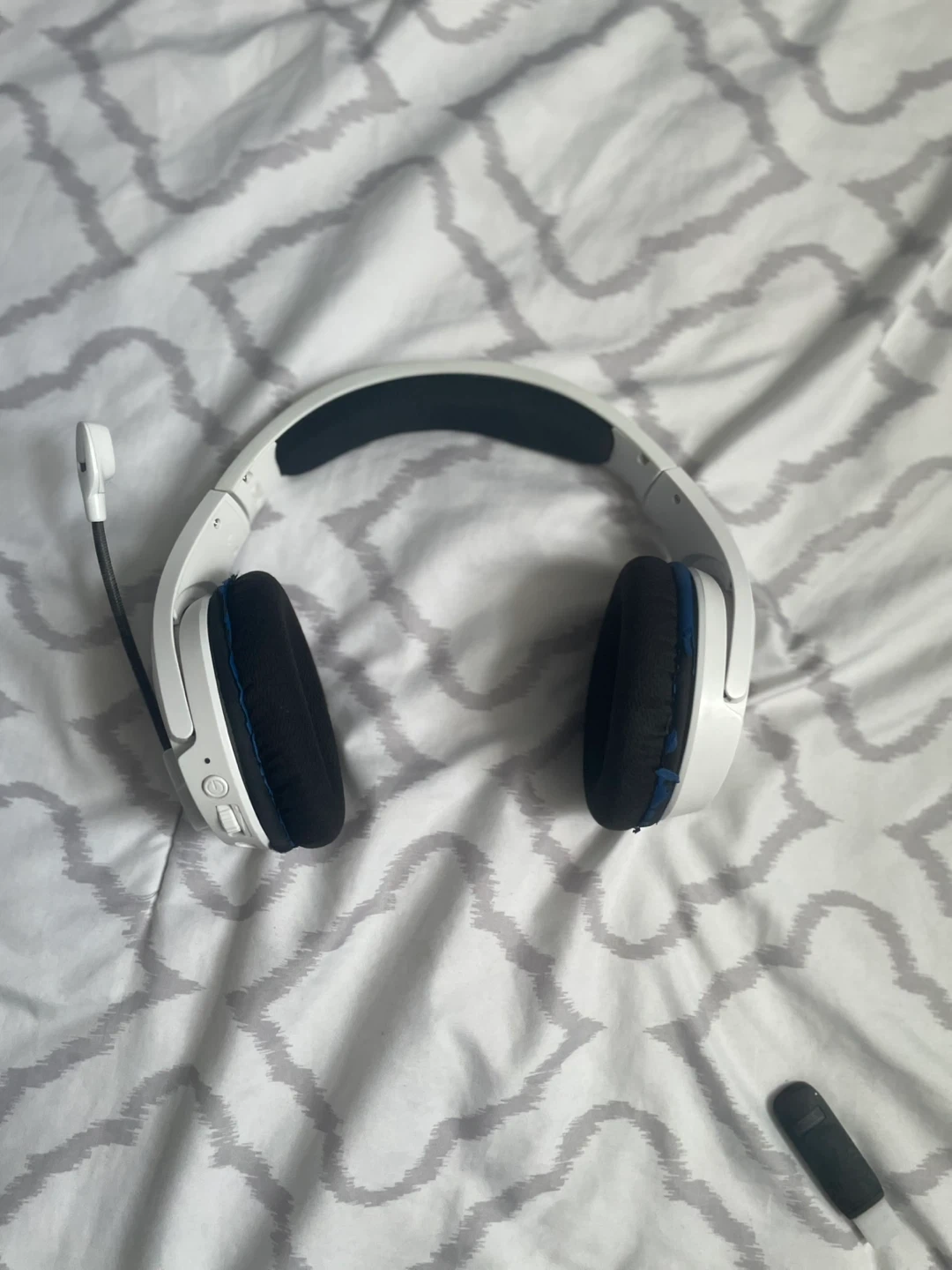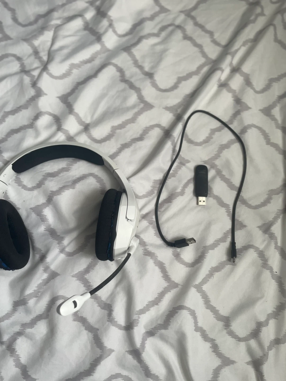 Selling a gaming headset in white! It comes with a microphone and a USB dongle. Perfect for gaming or online meetings