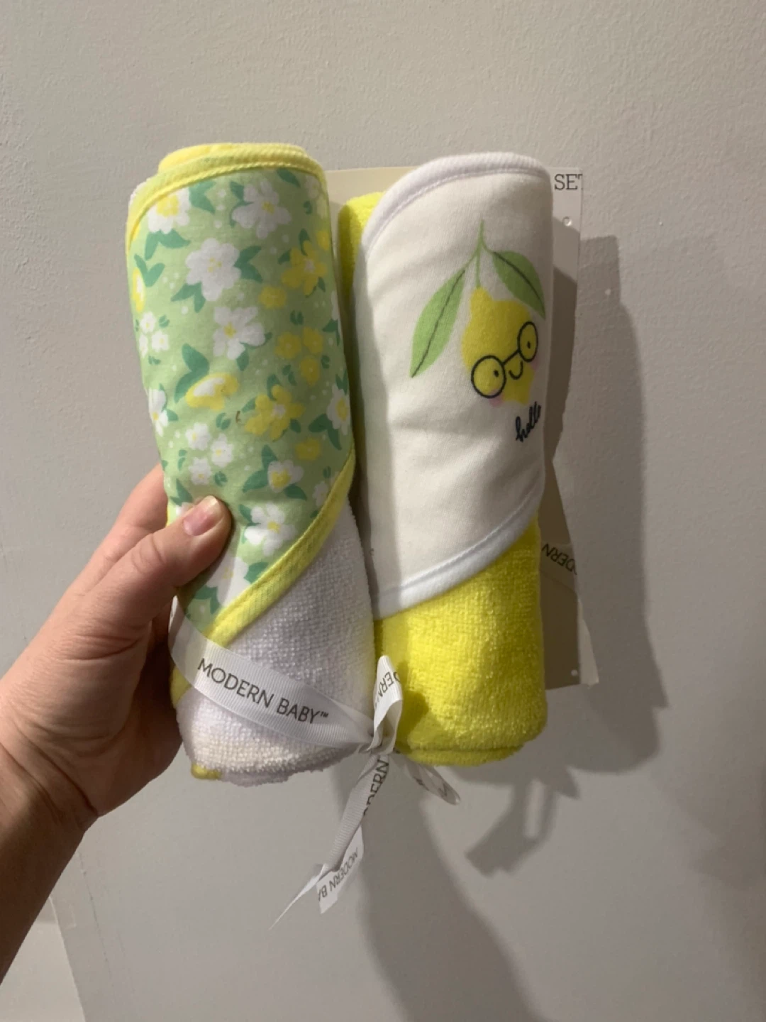 Set of two towels from Modern Baby. One features a cute lemon graphic with glasses, and the other has a green floral pattern. They're made of a soft, absorbent material. Note this was from a bigger pack we just never got to these ones before baby didn’t need them anymore. These are both new.