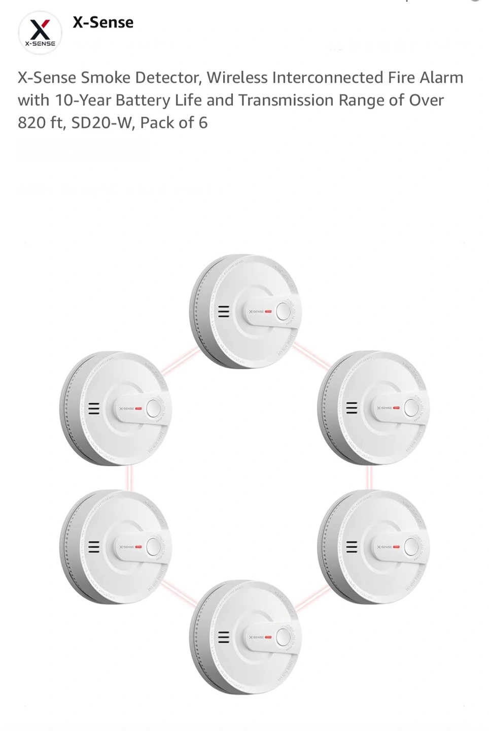 Selling a pack of 6 X-Sense SD20-W smoke detectors. These are wireless interconnected fire alarms with a 10-year battery life and a transmission range of over 820 ft. Each detector has a built-in lithium battery with a 10-year lifespan, so no need to worry about replacements! The dimensions are 4.8 inches (12.2 cm).