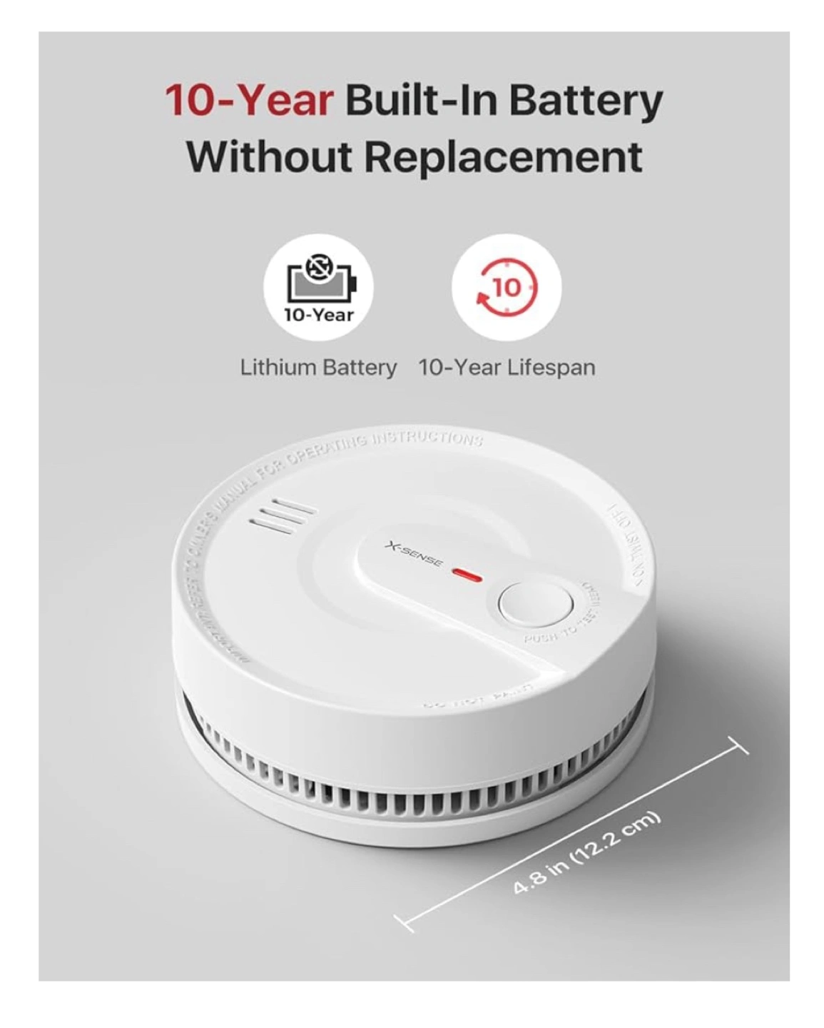 Selling a pack of 6 X-Sense SD20-W smoke detectors. These are wireless interconnected fire alarms with a 10-year battery life and a transmission range of over 820 ft. Each detector has a built-in lithium battery with a 10-year lifespan, so no need to worry about replacements! The dimensions are 4.8 inches (12.2 cm).