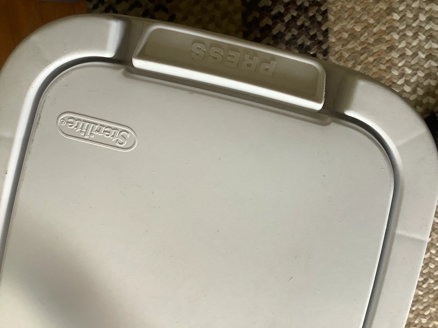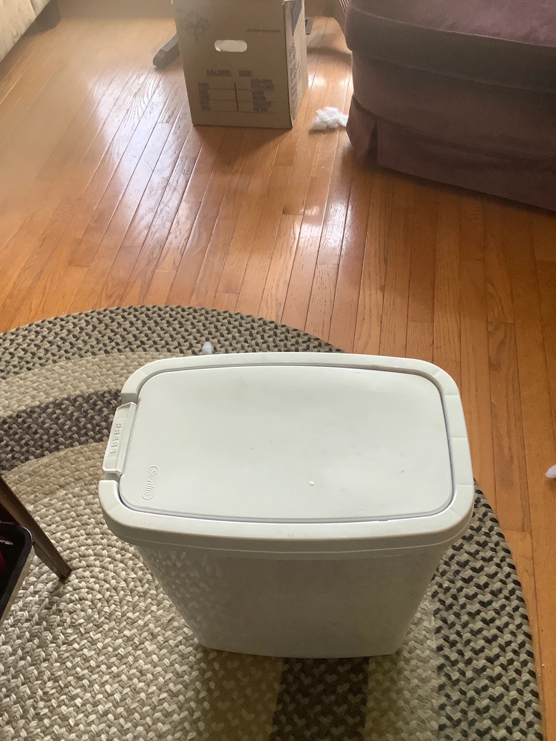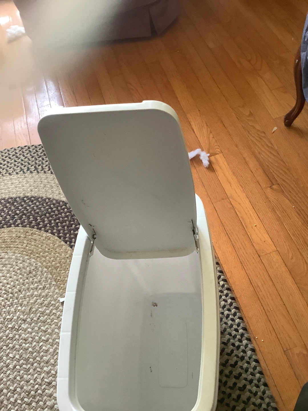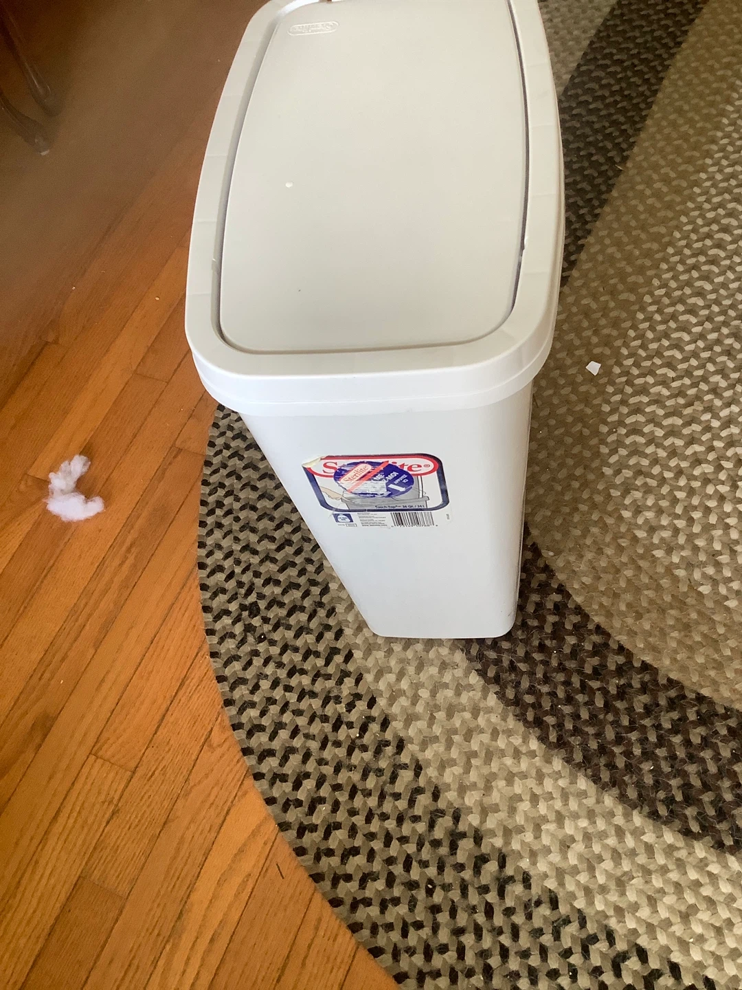This is a white Sterilite plastic trash can with a swing top lid. It's a handy size for many rooms. Easy to use with a simple swing mechanism. Pickup Newmarket