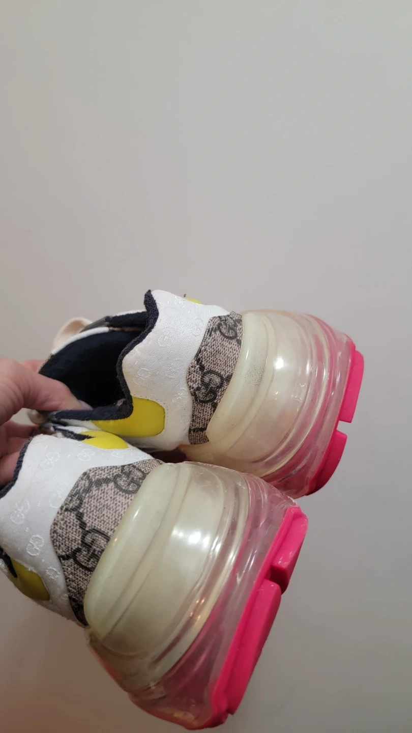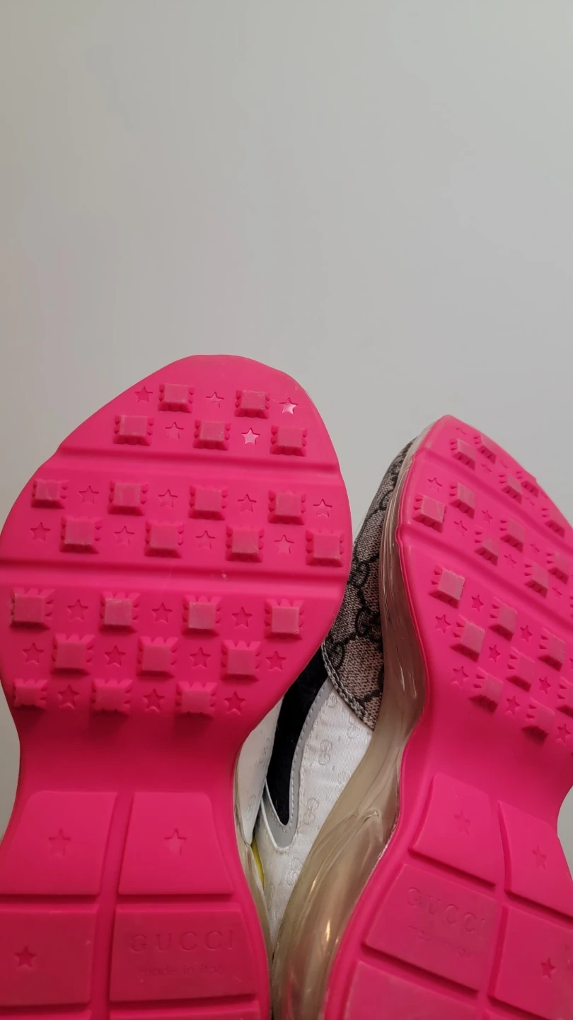 Gucci rython sneakers featuring the iconic GG Supreme canvas. They have a rubber sole and clear chunky heel. These shoes offer a bold, stylish look.