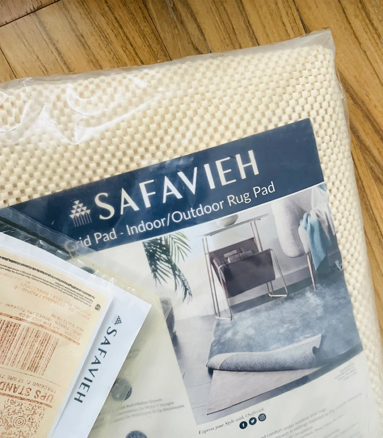 This is a Safavieh indoor/outdoor rug pad. It's designed to provide grip and protection for your rugs. The pad is 6' x 9' in size. It's made of a durable, woven material.