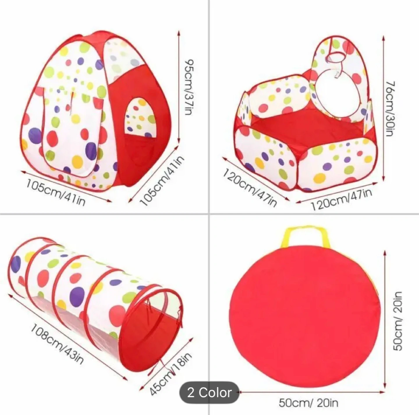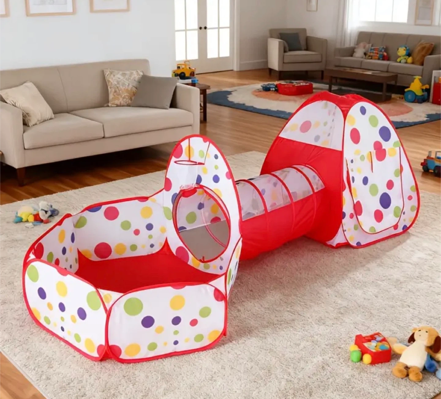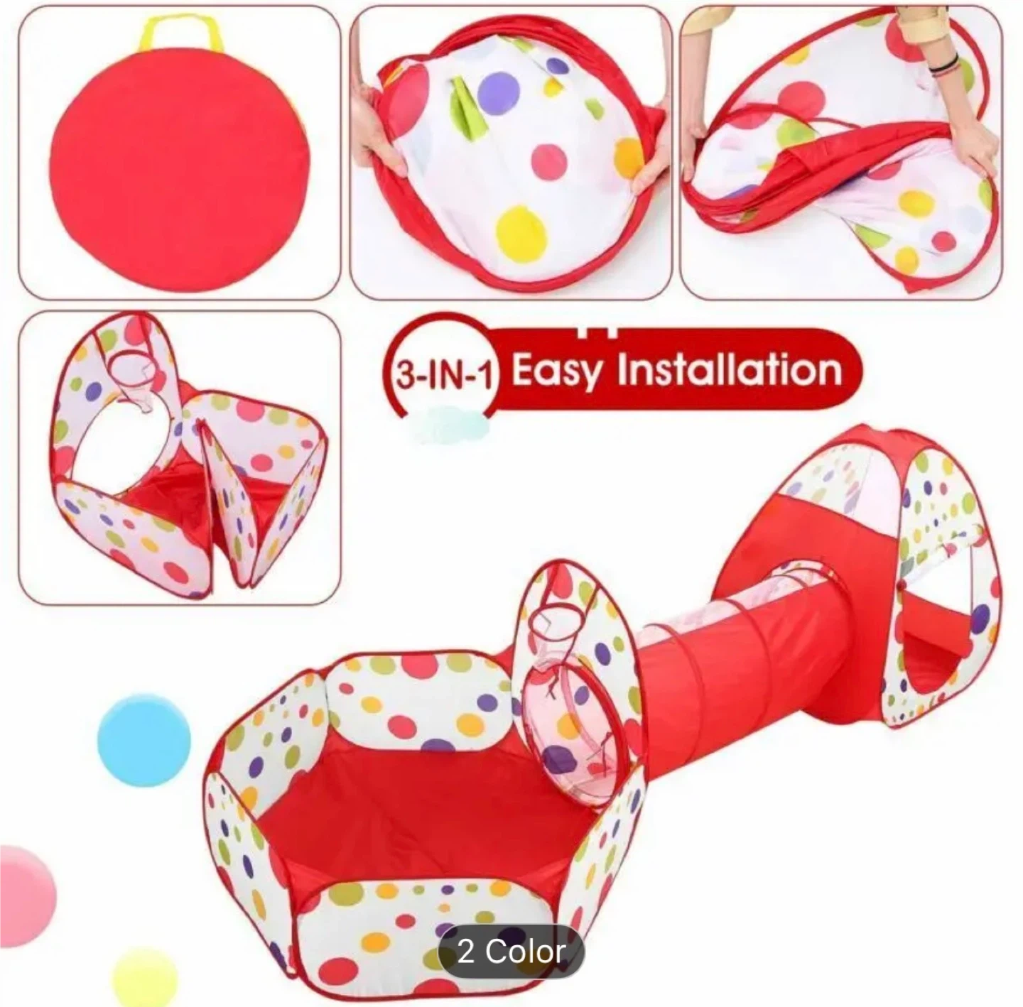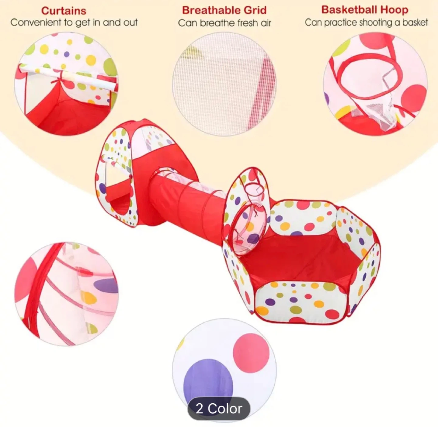 3-in-1 pop-up play tent, ball pit, and crawl tunnel set. It has several features: