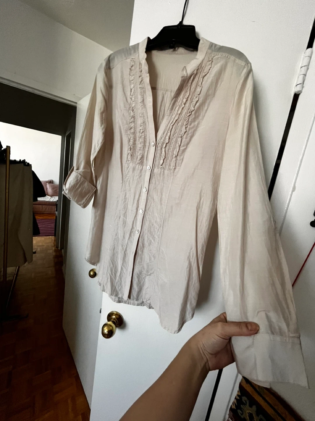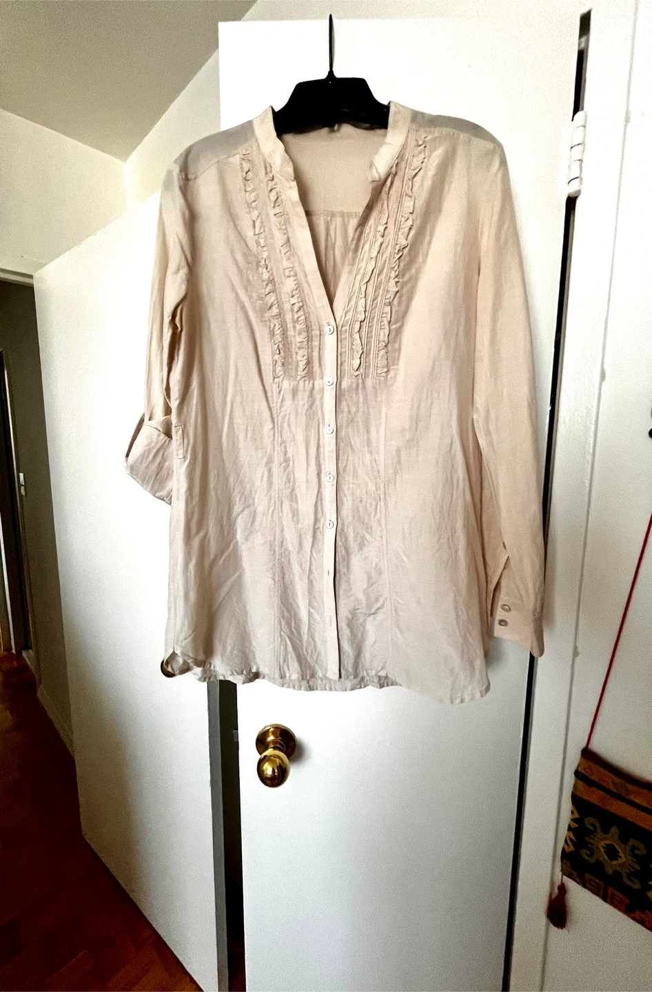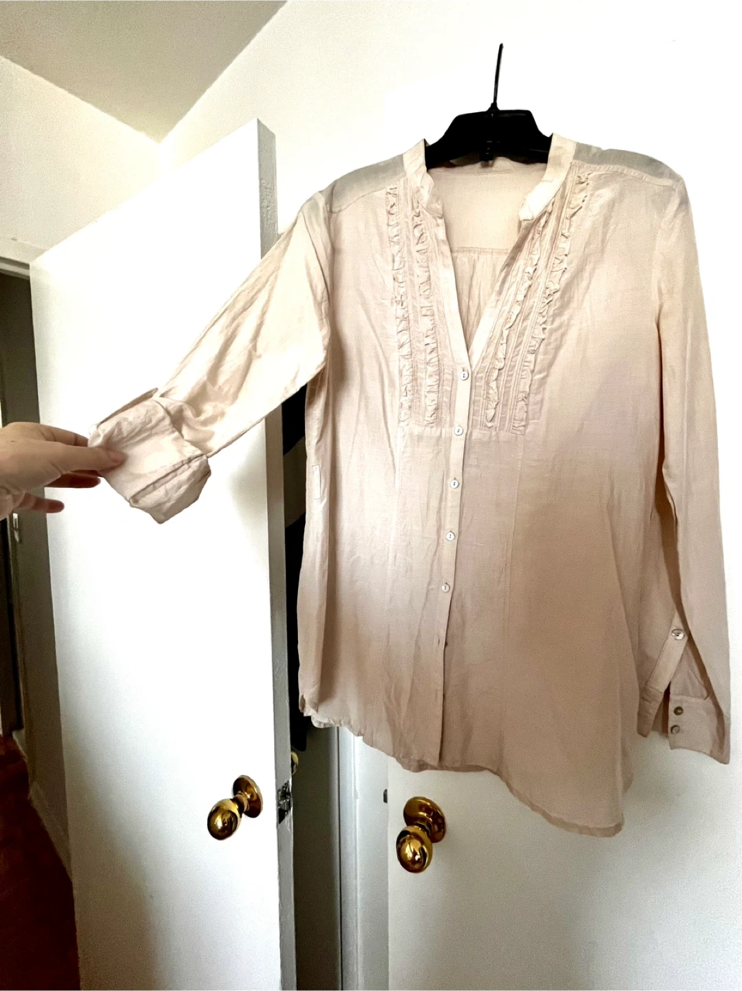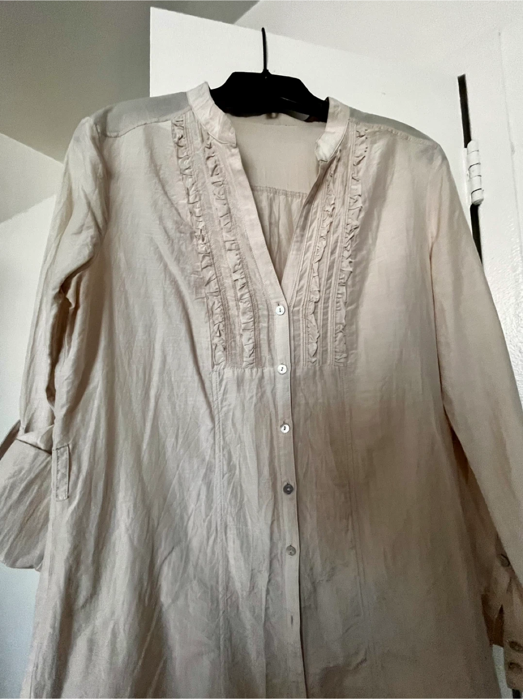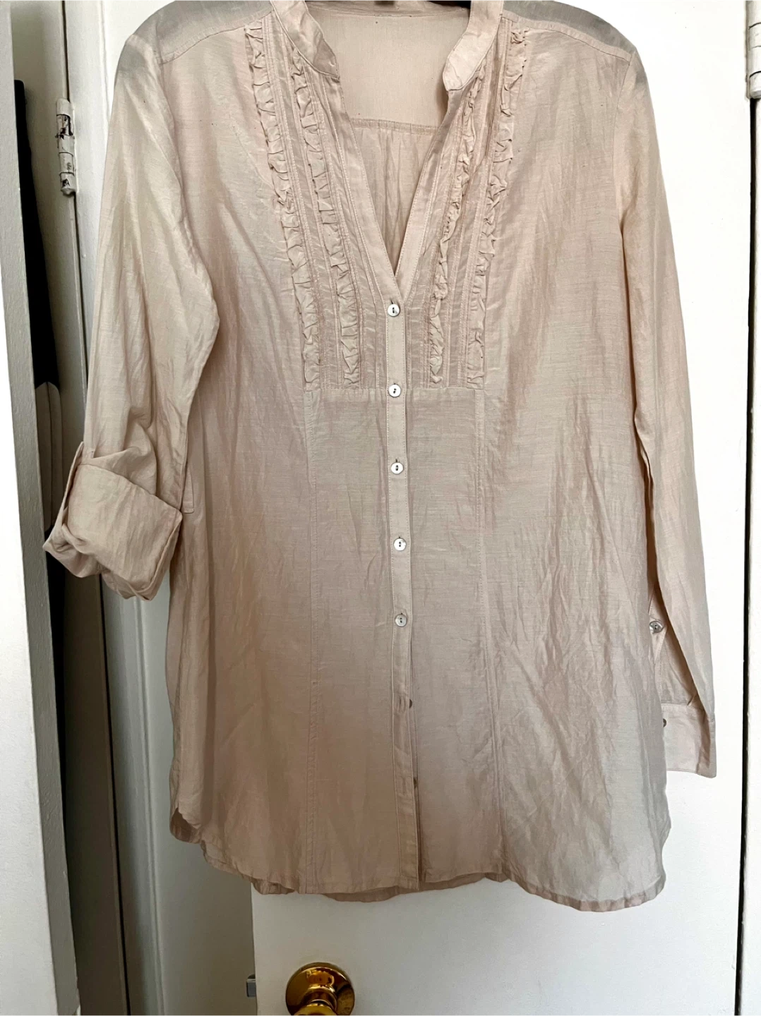 Lightweight silk blouse with a V-neck and ruffled detail down the front. It has long sleeves that can be rolled up and secured. Button closure all the way up. Can be worn even as a layer over a tank top and buttons opened. Size S. Pick up downtown Toronto. Please check my other listings, great items at great prices. Discount for bundles.🫶