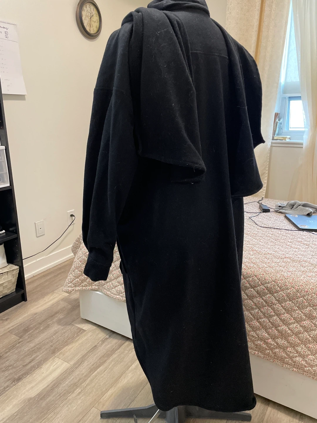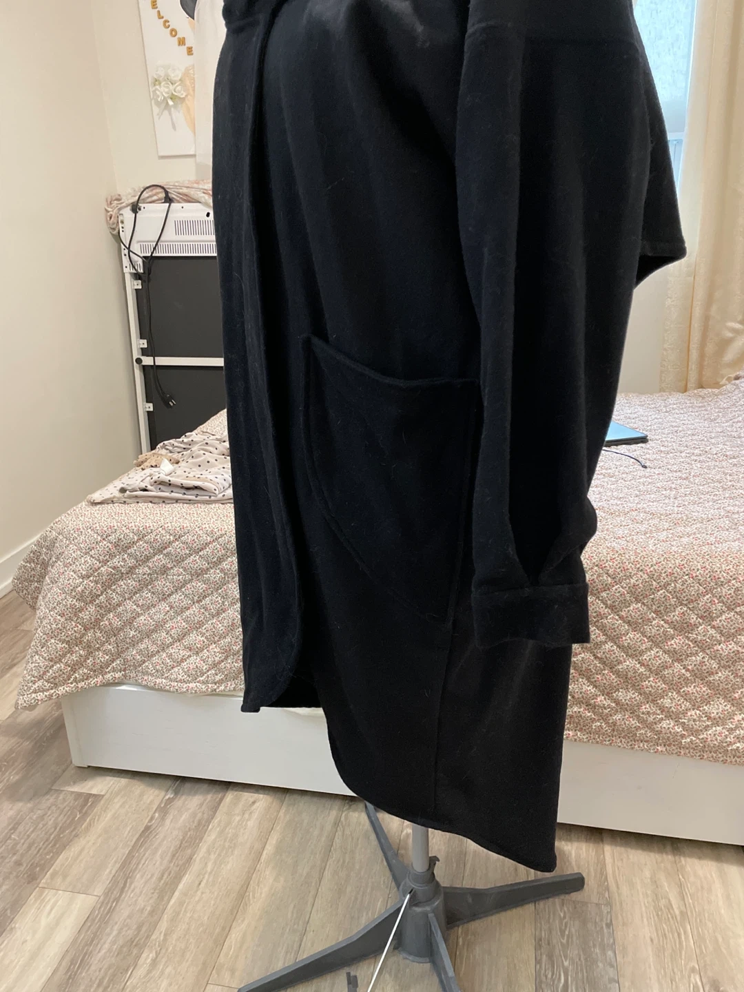 Cozy black cardigan with a shawl collar and front pockets. It's made of a soft, comfortable material, perfect for layering. The design offers a relaxed fit.