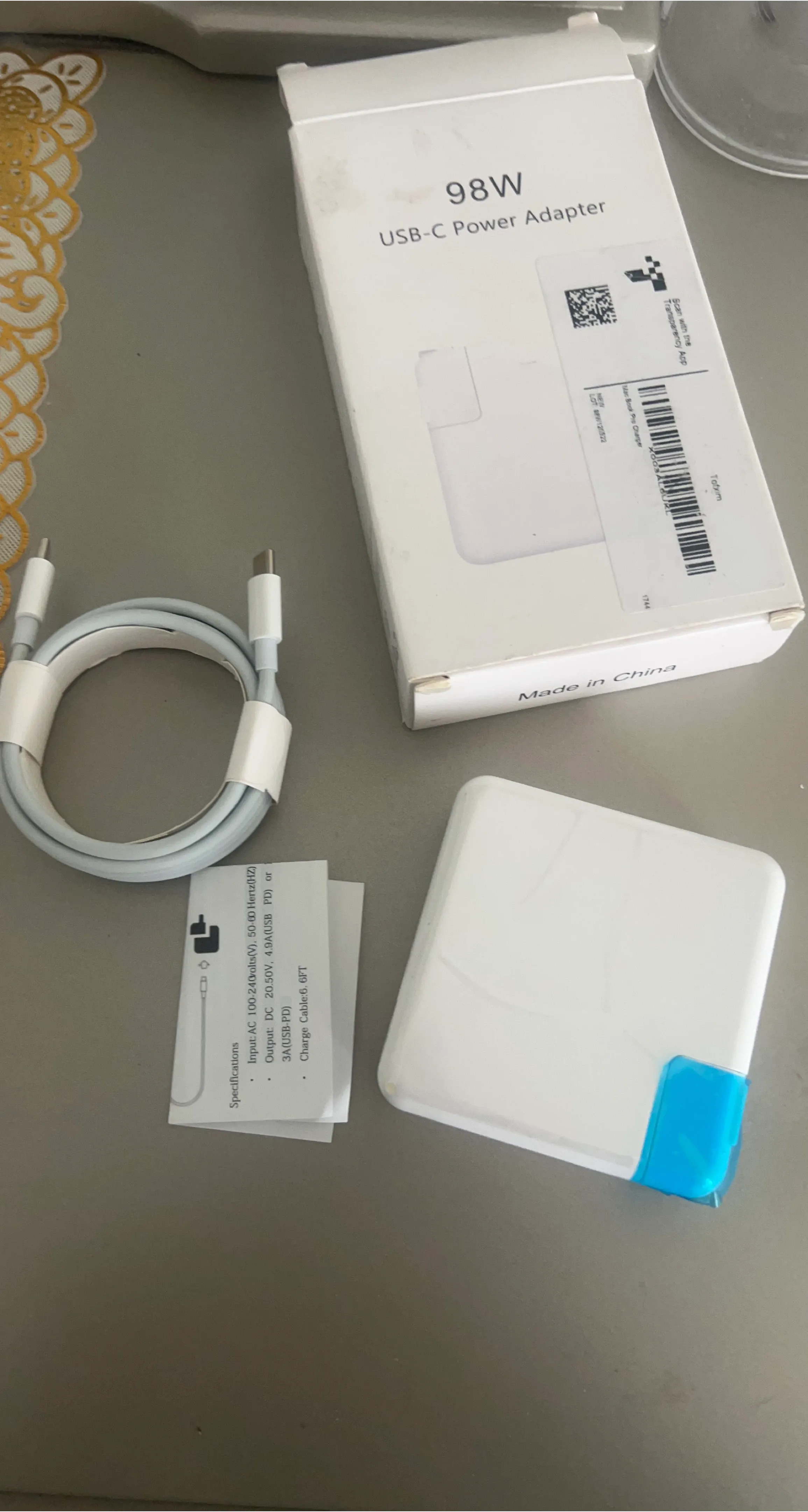 This is a 98W USB-C power adapter with a 6FT charge cable. It supports input AC 100-240V and outputs DC 20.50V, 4.9A or 3A. It's a great replacement for your laptop or other USB-C devices. Made in China.