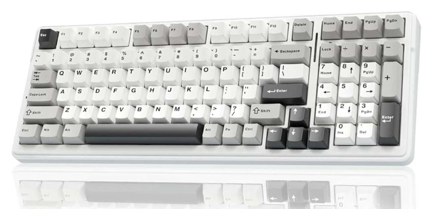 This is a white mechanical keyboard with a full numpad. It features a split color keycap design. It's a standard layout keyboard.