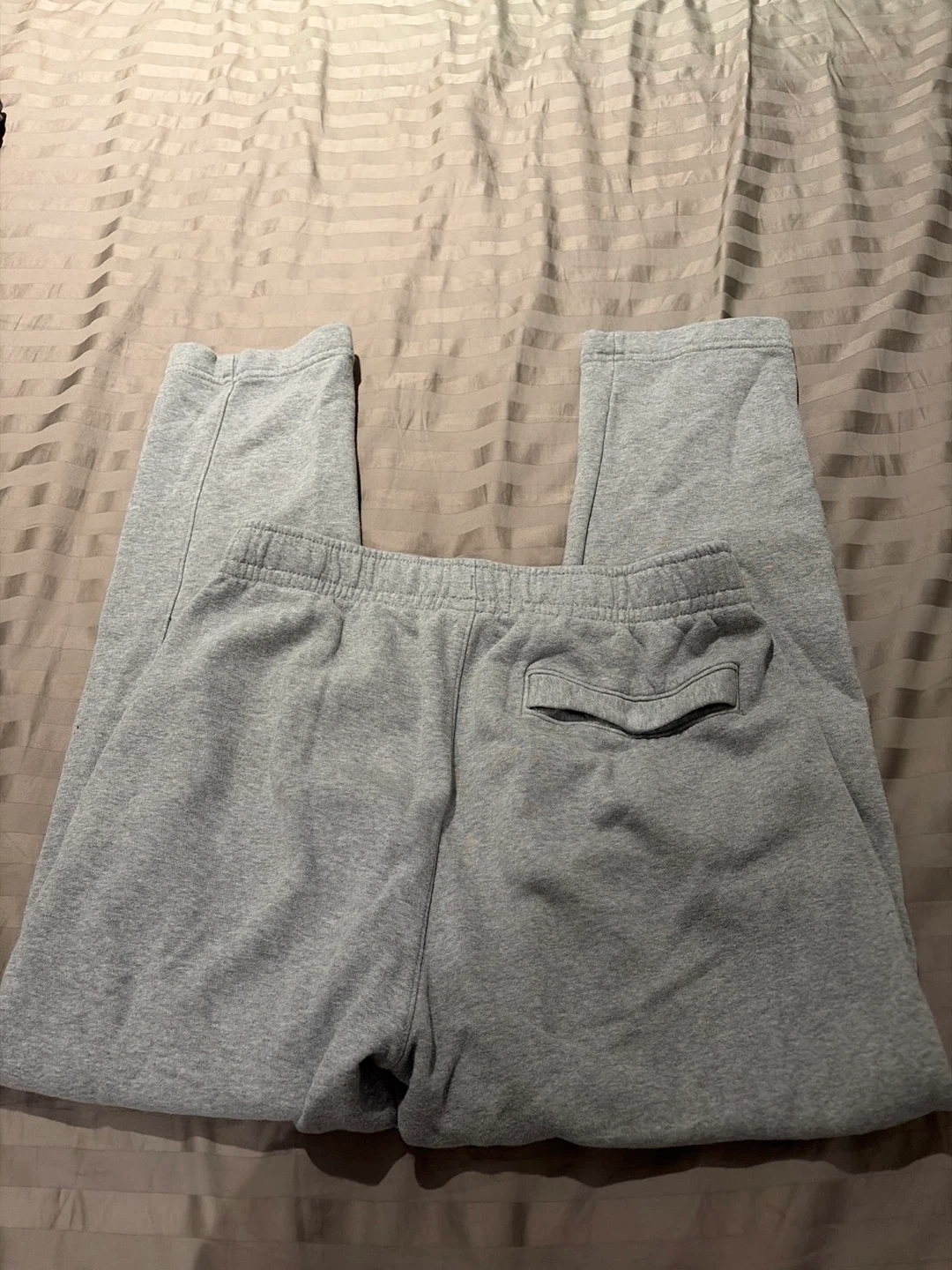 These are Nike grey sweatpants in a size medium. They're made of a soft, comfortable material. These pants are great for casual wear or athletic activities!