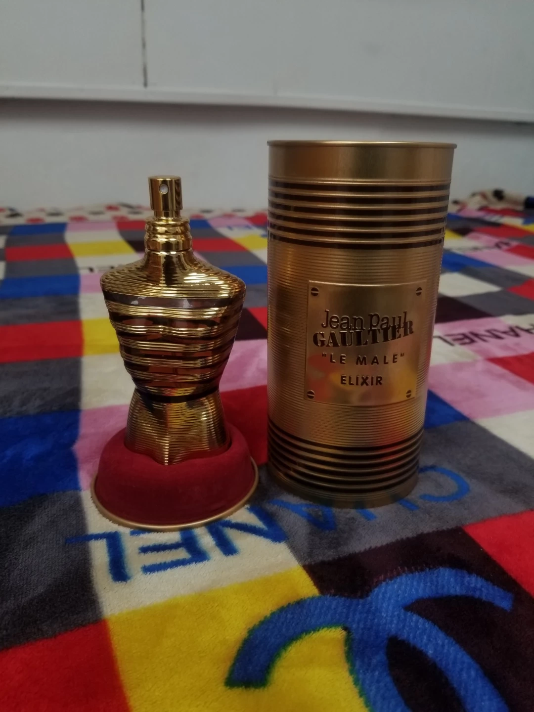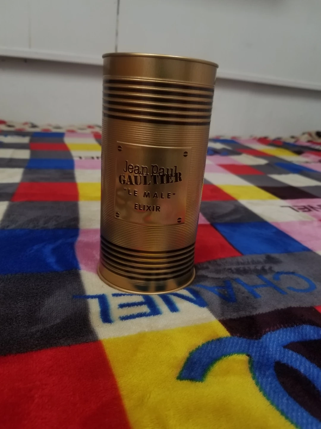 This is the Jean Paul Gaultier Le Male Elixir perfume. It comes in a golden ribbed bottle with a matching cylindrical case. The fragrance offers a warm and sweet scent profile.
