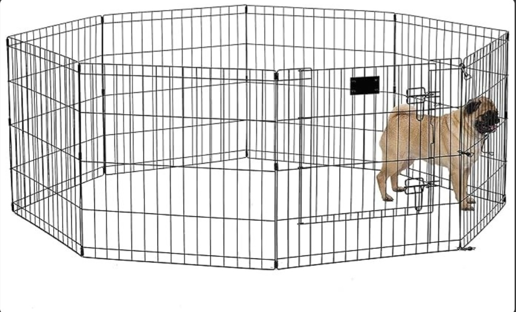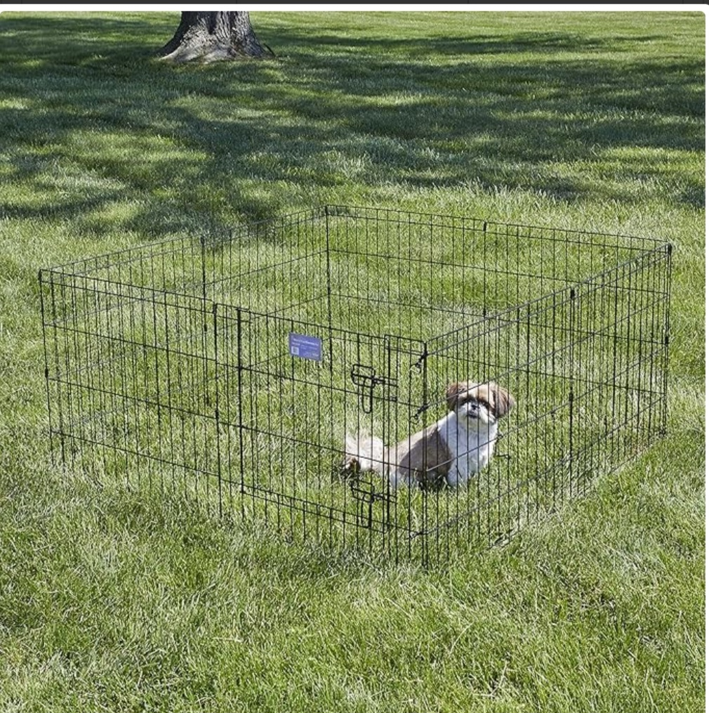 Black metal pet playpen. Durable ecoat finish. Easy setup, no tools needed. Folds flat for storage. Includes ground anchors and corner stabilizers. Secure double latch door. Panels measure 24" W x 24" H. Suitable for indoor or outdoor use.