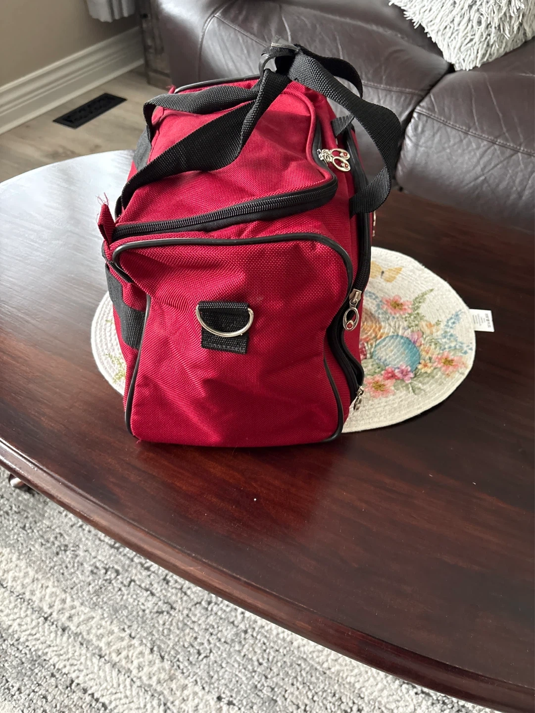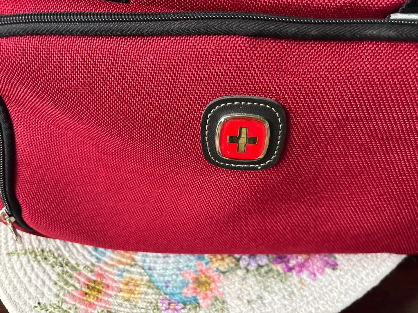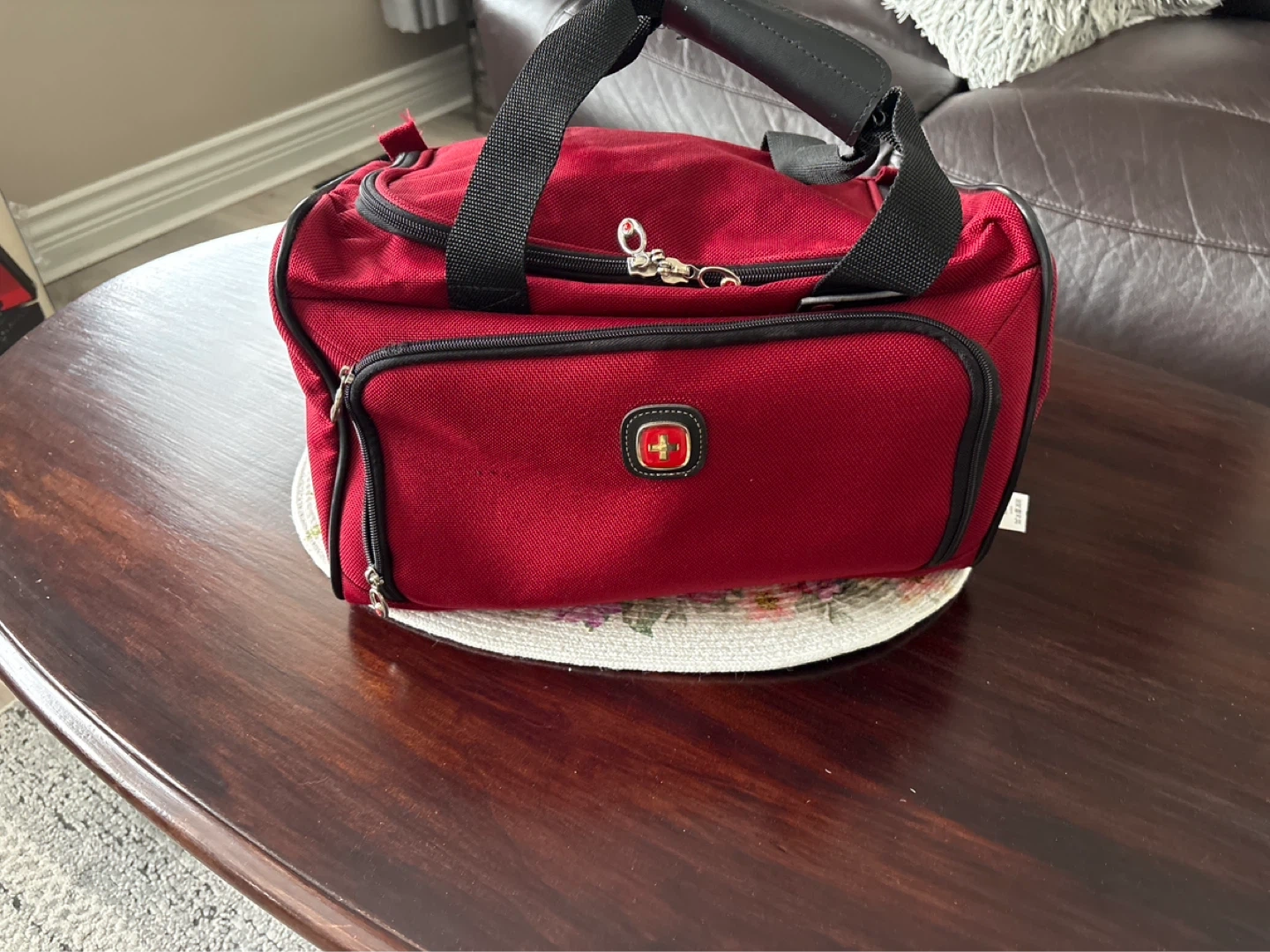 This is a red duffle bag from Swiss Gear. It features Red accents and sturdy handles. Perfect for weekend trips or gym essentials! Excellent condition like new