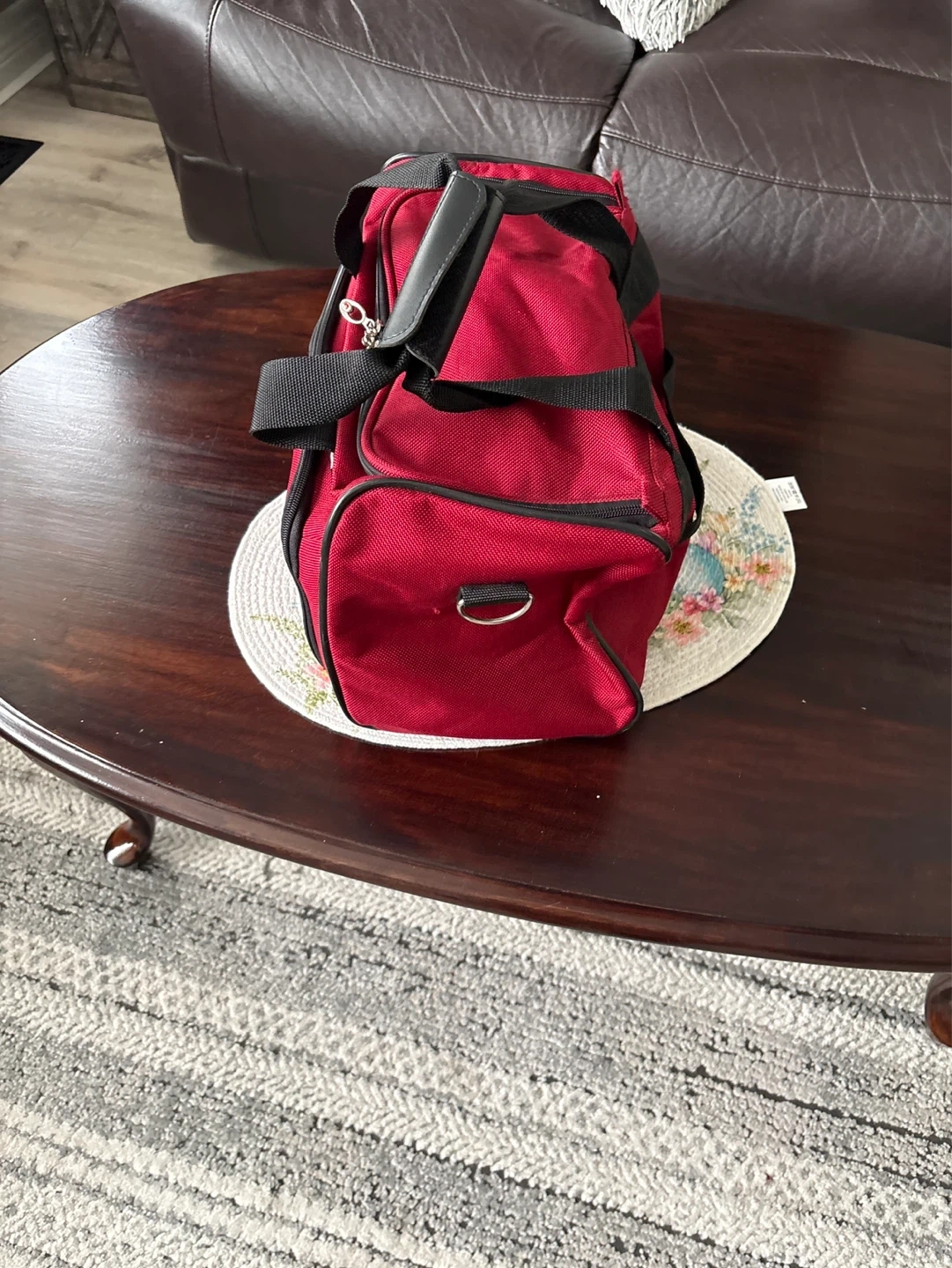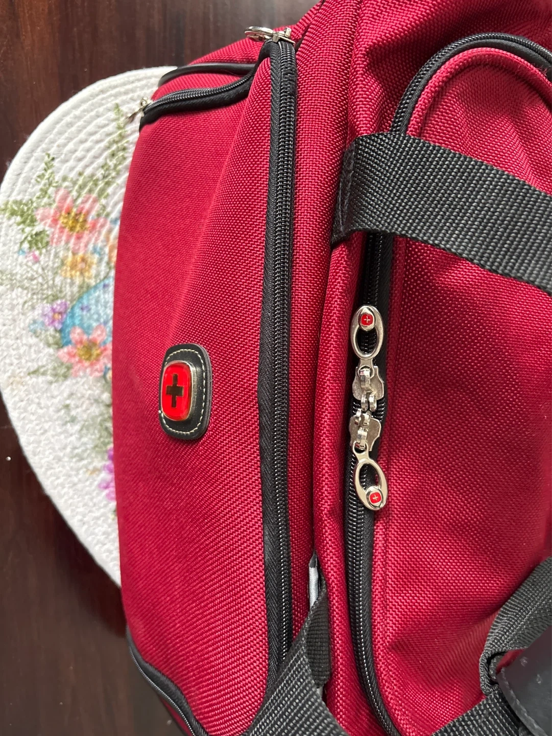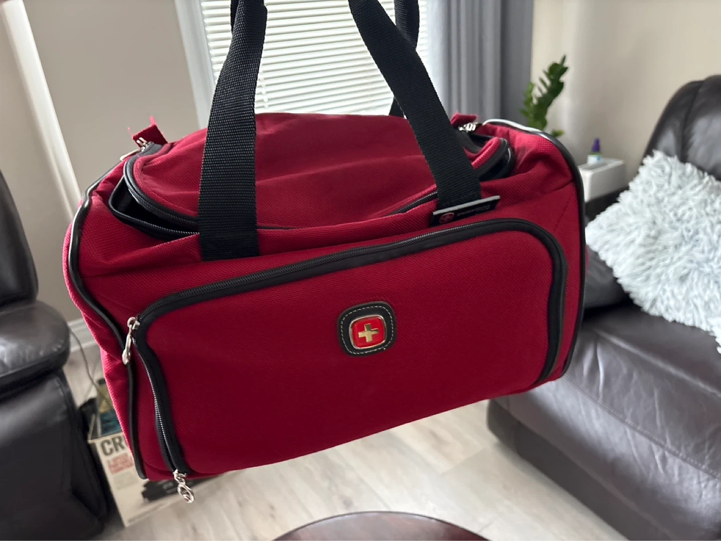 This is a red duffle bag from Swiss Gear. It features Red accents and sturdy handles. Perfect for weekend trips or gym essentials! Excellent condition like new