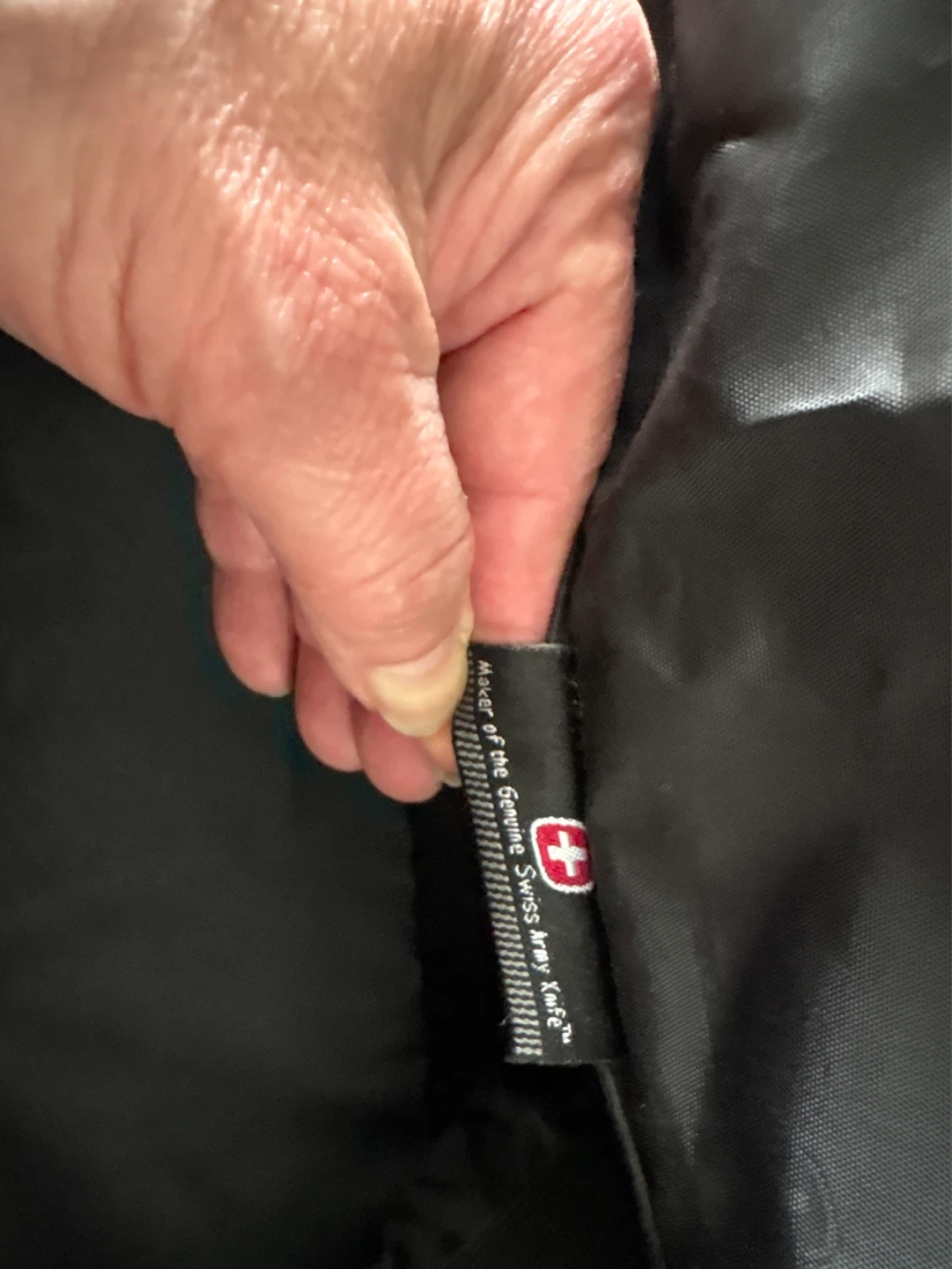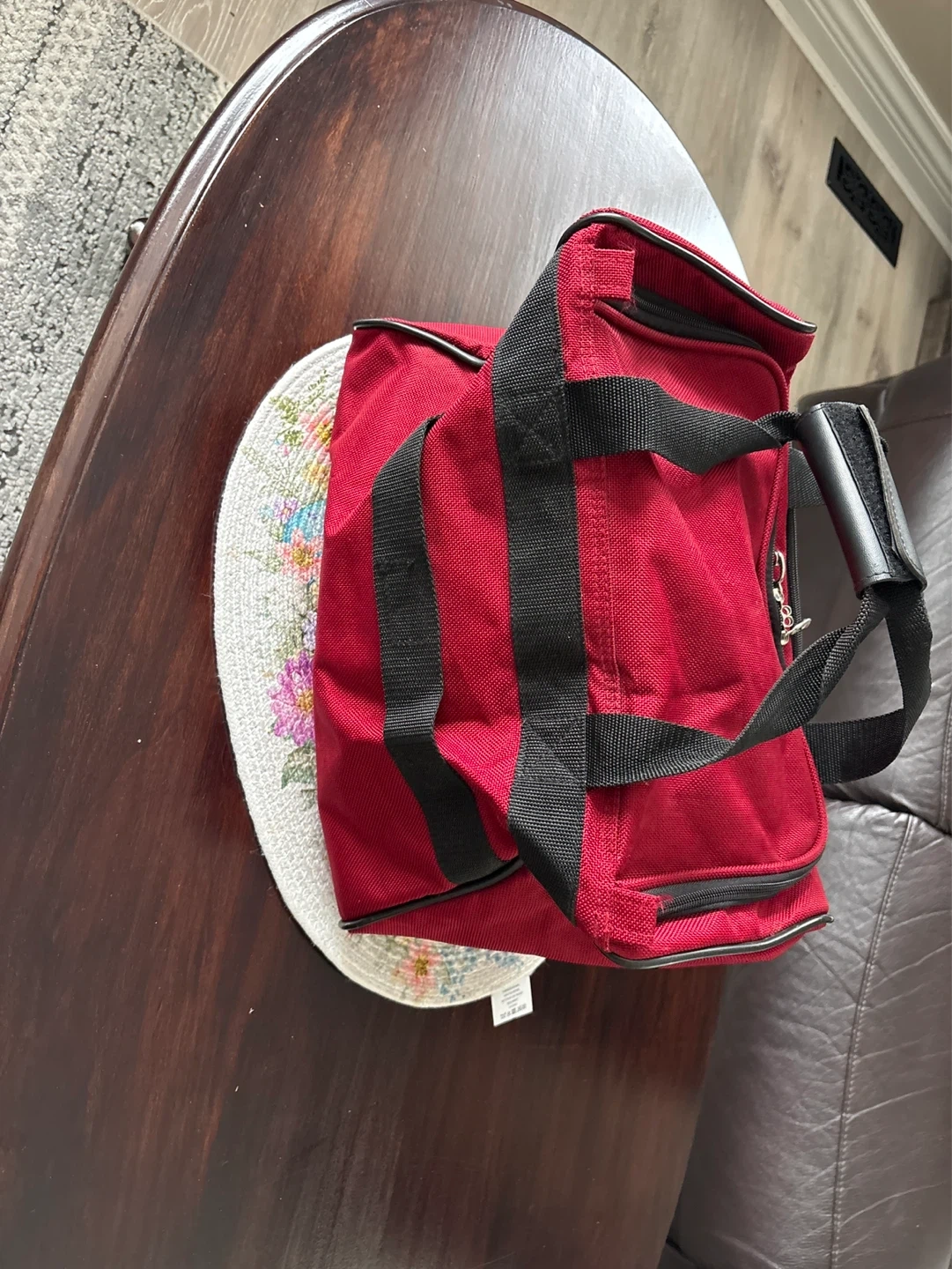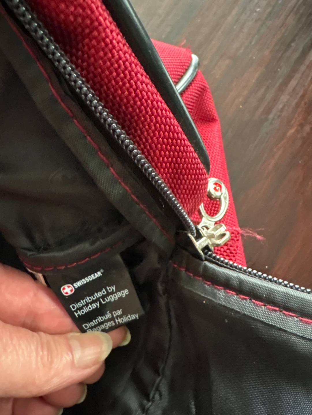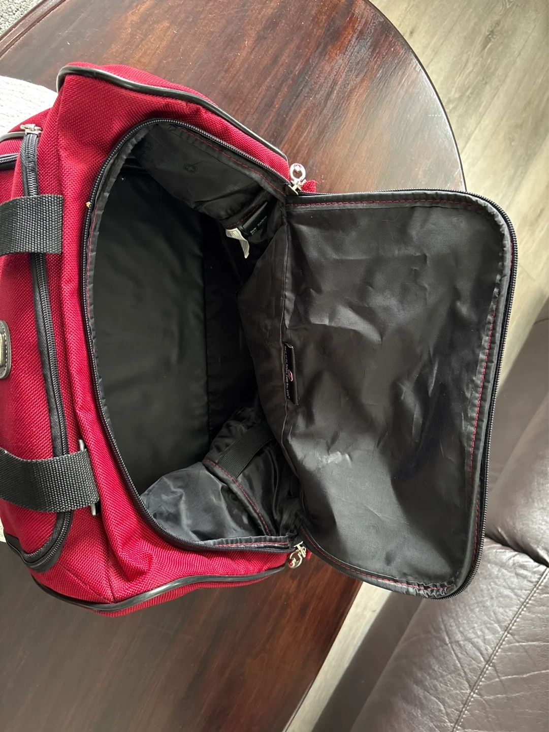 This is a red duffle bag from Swiss Gear. It features Red accents and sturdy handles. Perfect for weekend trips or gym essentials! Excellent condition like new