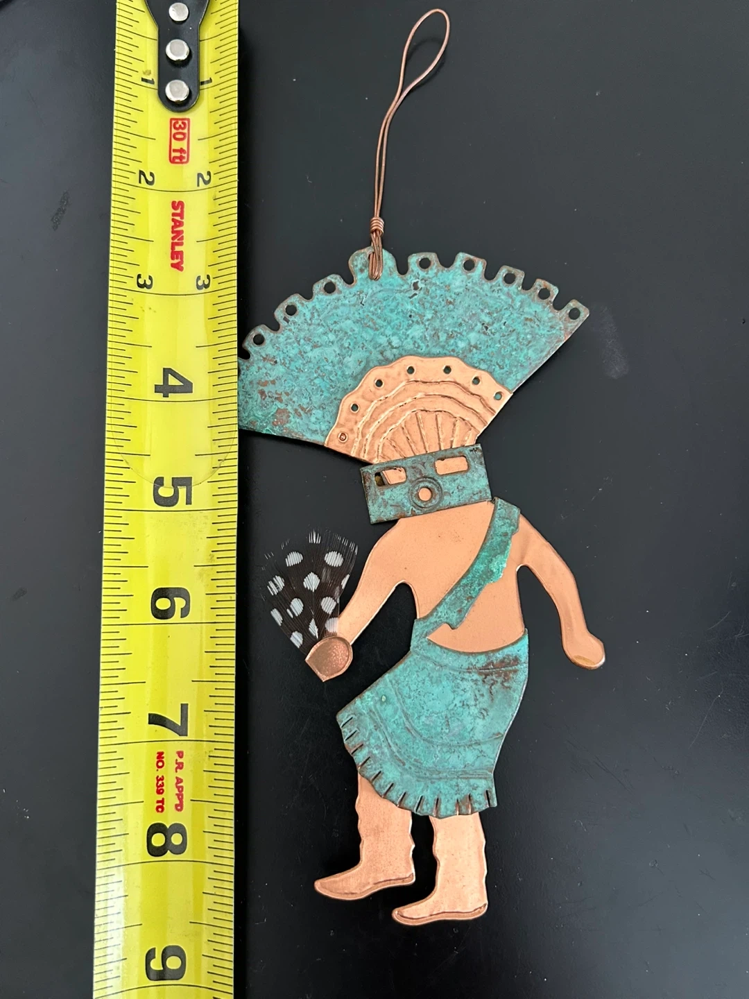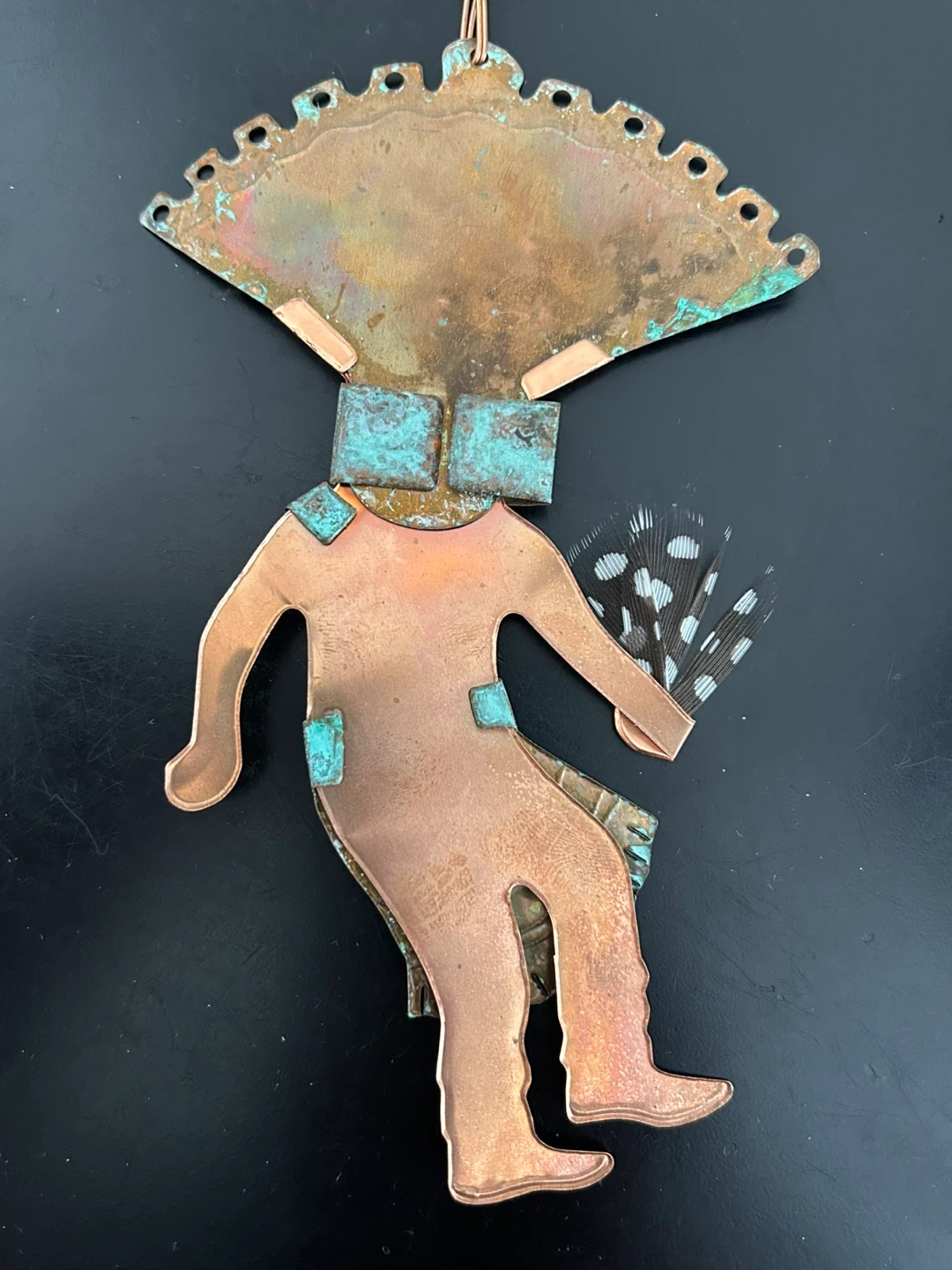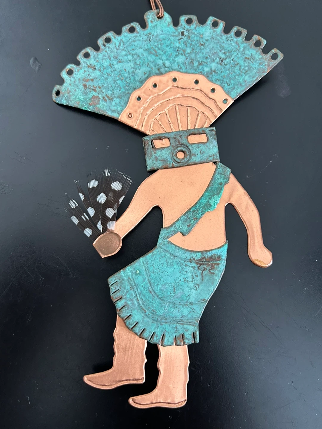 Unique Southwestern-inspired Kachina dancer wall art, handcrafted from mixed metals (copper and brass) with a natural verdigris patina on the headdress and kilt. The figure is accented with real black-and-white spotted feathers, adding texture and movement.