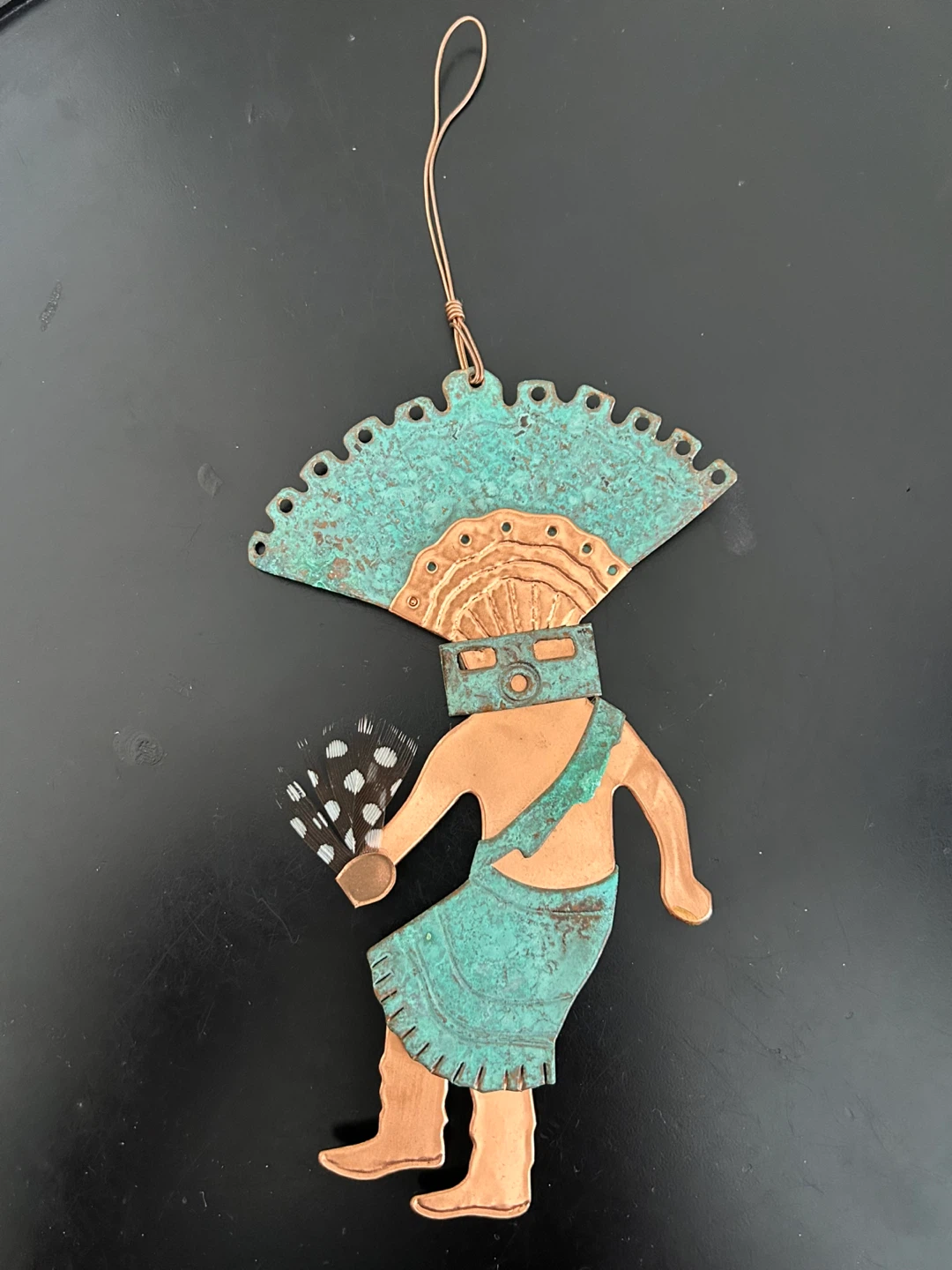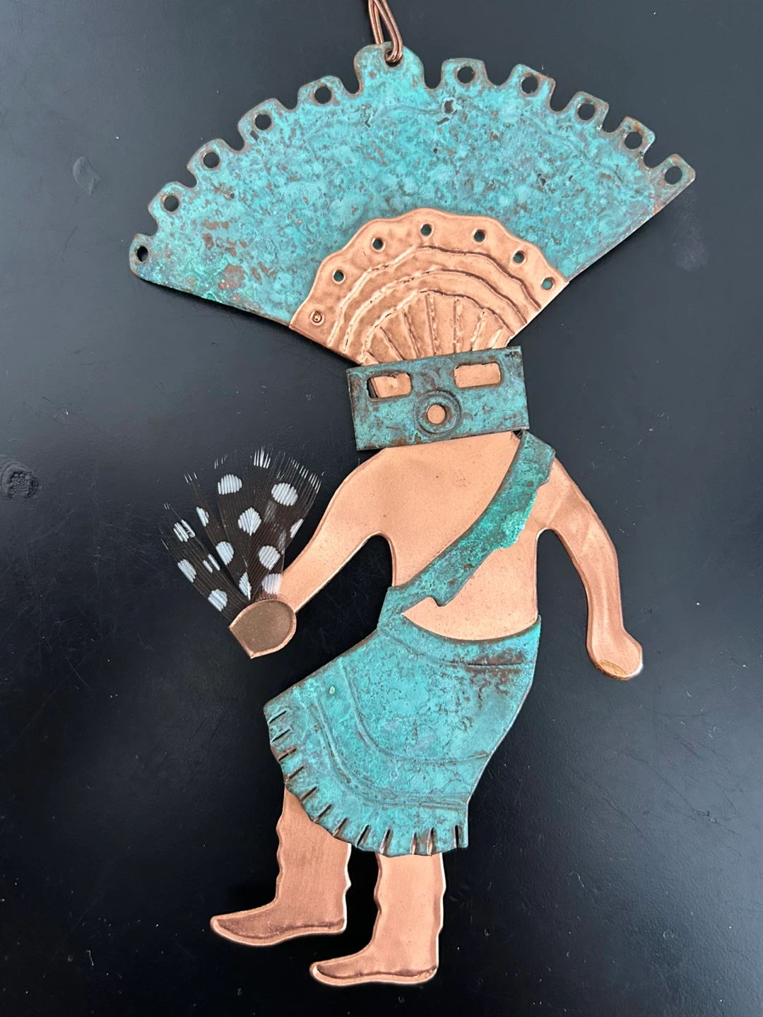 Unique Southwestern-inspired Kachina dancer wall art, handcrafted from mixed metals (copper and brass) with a natural verdigris patina on the headdress and kilt. The figure is accented with real black-and-white spotted feathers, adding texture and movement.