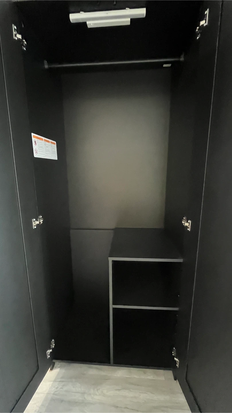 This is an IKEA BRIMNES wardrobe with two doors in black. It measures 78x50x190 cm and includes a hanging rod and shelves. Perfect for storing clothes and accessories! Very clean and came from smoke/pet-free home.