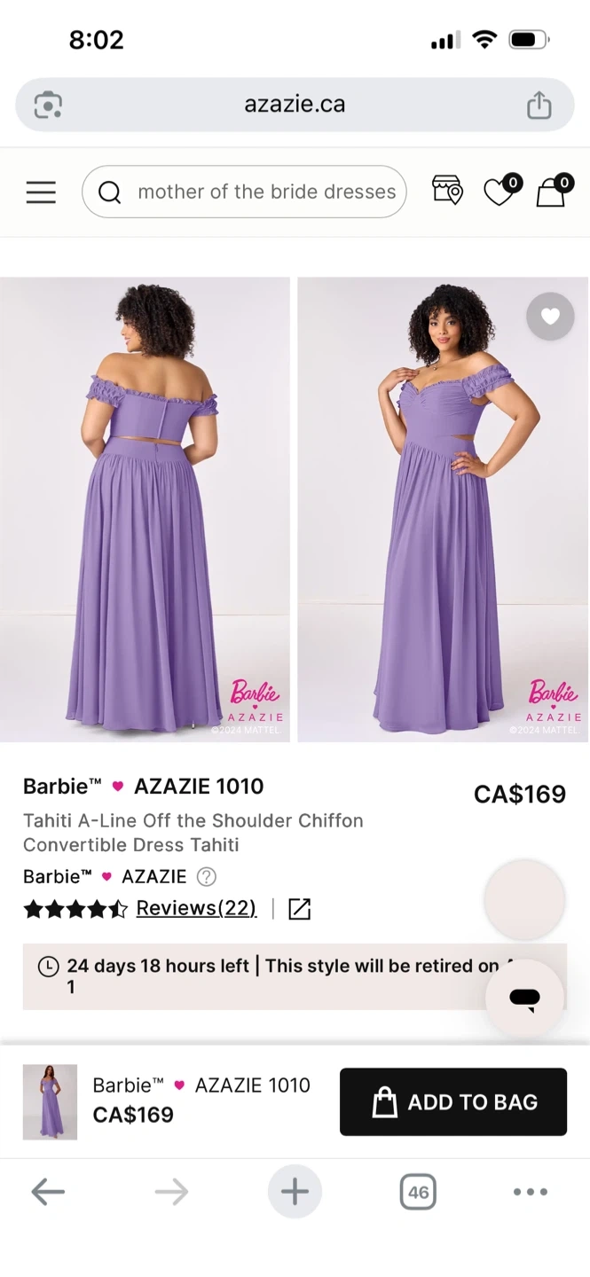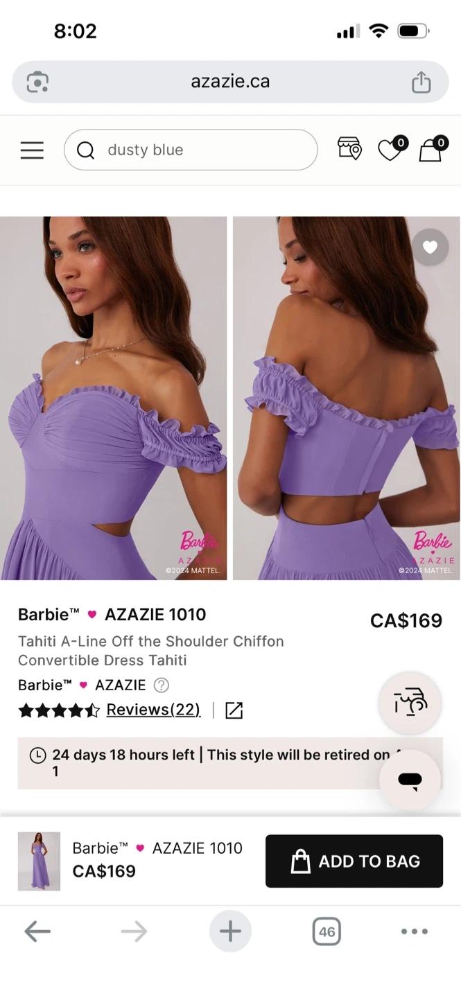 This Barbie x Azazie Tahiti dress features an off-the-shoulder chiffon A-line design. It has a convertible style for versatile wear. Perfect for a wedding or formal occasion!