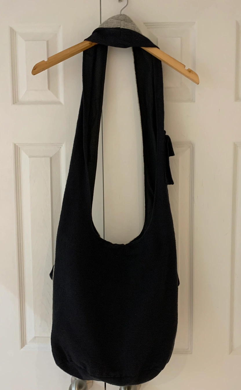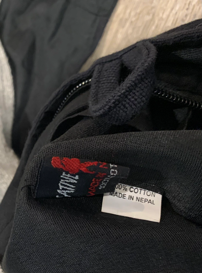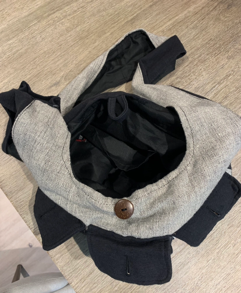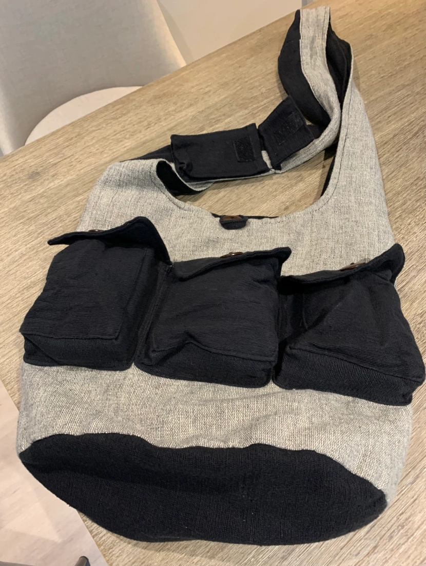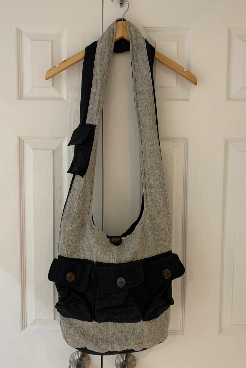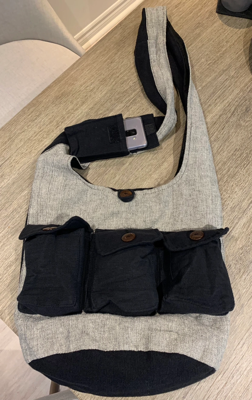 This cotton bag, made in Nepal, has 3 button up pockets in the front, 1 on the strap (can hold cell phone) and and 1 interior zip pocket The strap drop measures approx. 21”