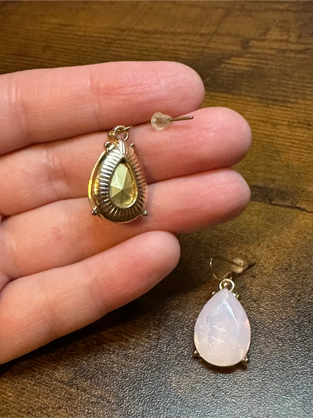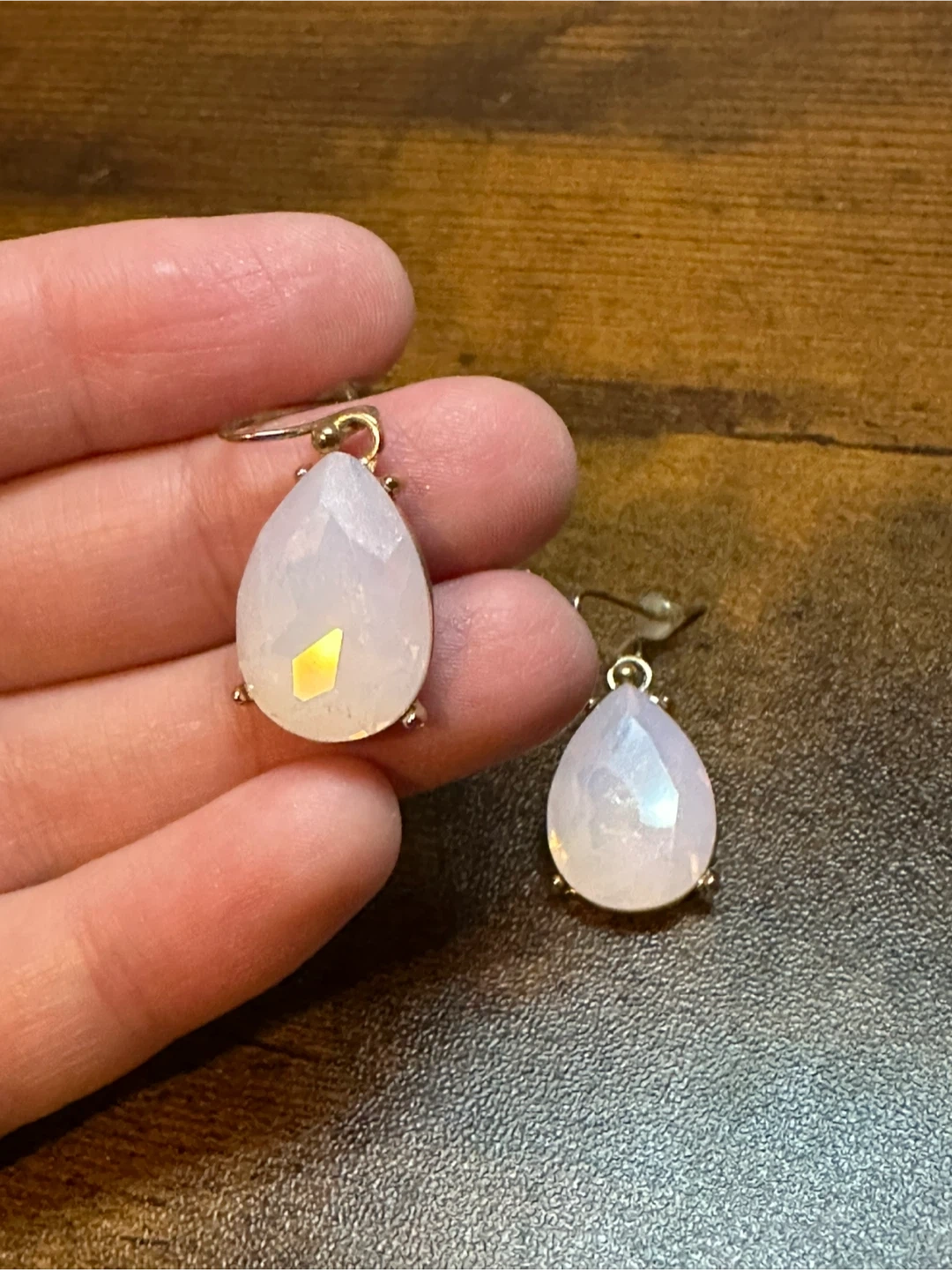 Pair of teardrop gemstone earrings in a light, pearlescent colour. They have a gold-toned setting with a hook backing. These earrings add a touch of subtle sparkle to any outfit.