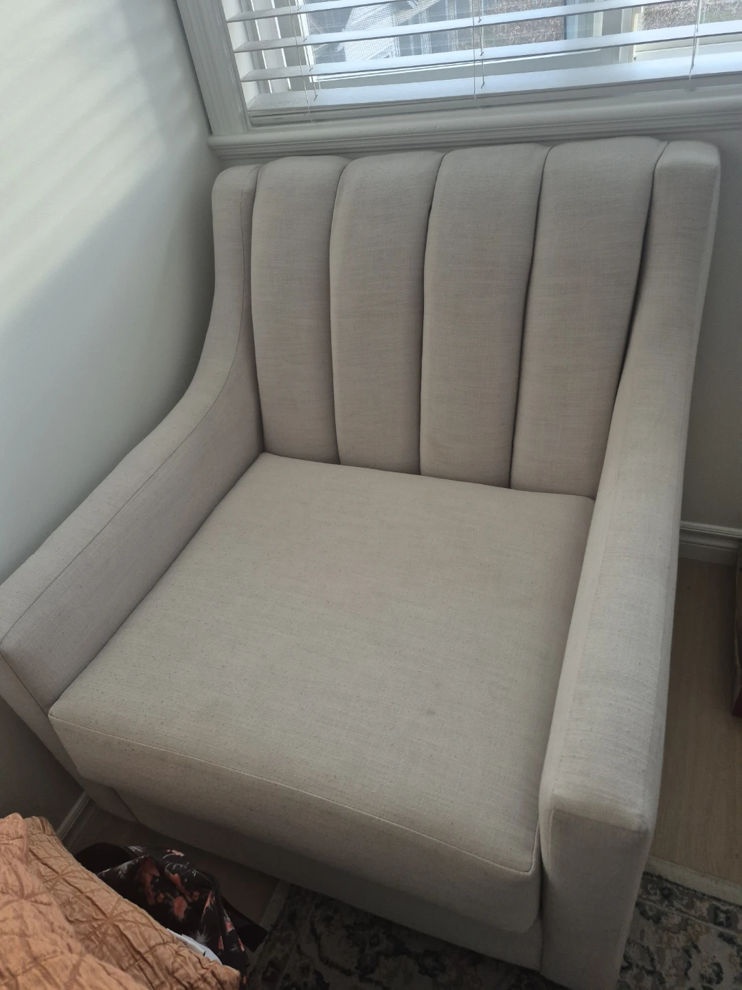 Selling a comfy beige accent chair! It's in great condition and would look lovely in any living room or bedroom. It features a stylish design with vertical channel tufting on the backrest and sturdy armrests for added comfort. Pick up only