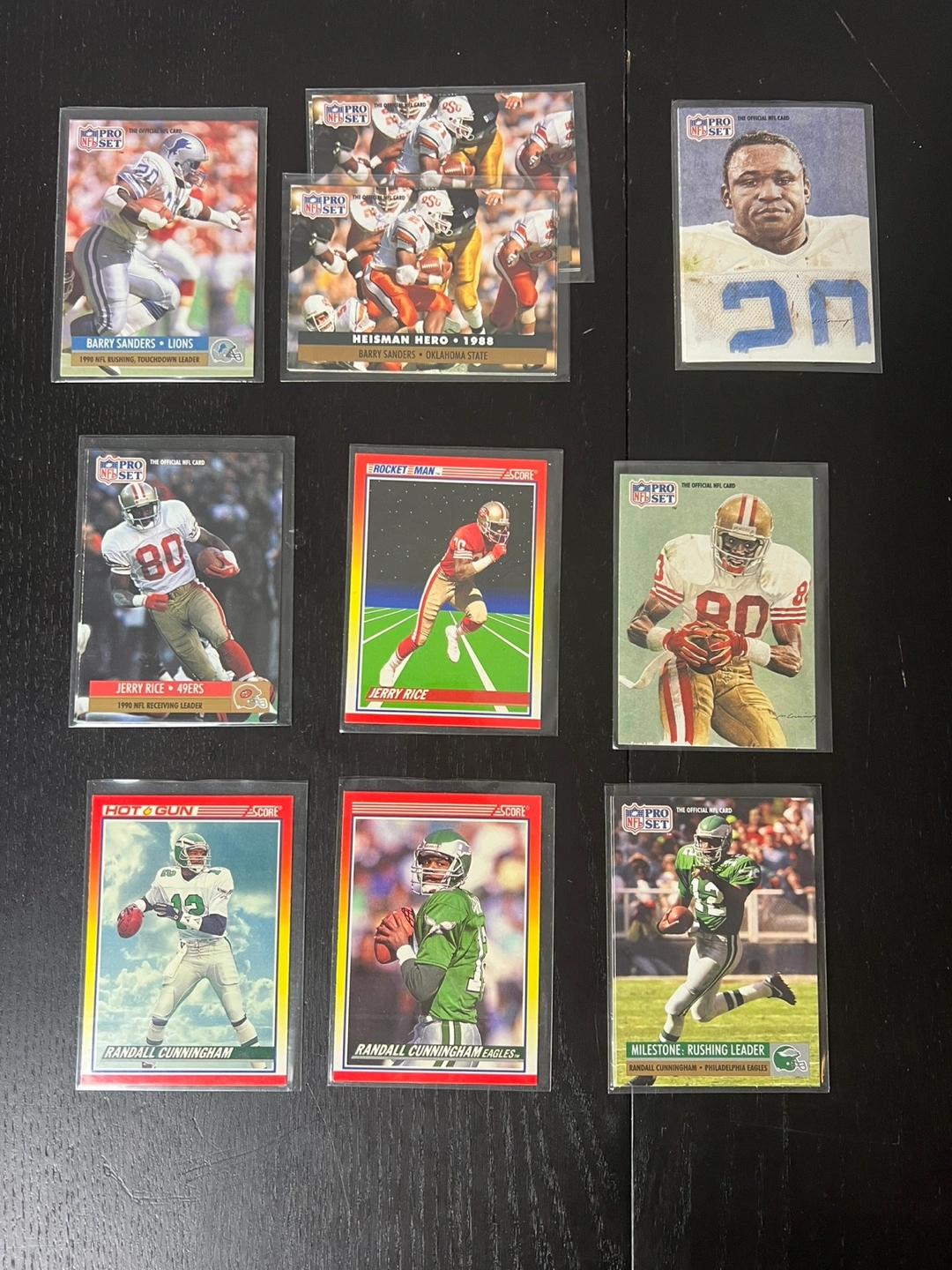 Football Card Lot – 3 Jerry Rice, 3 Barry Sanders, 3 Randall Cunningham + Duplicates – 30 Years in Storage!